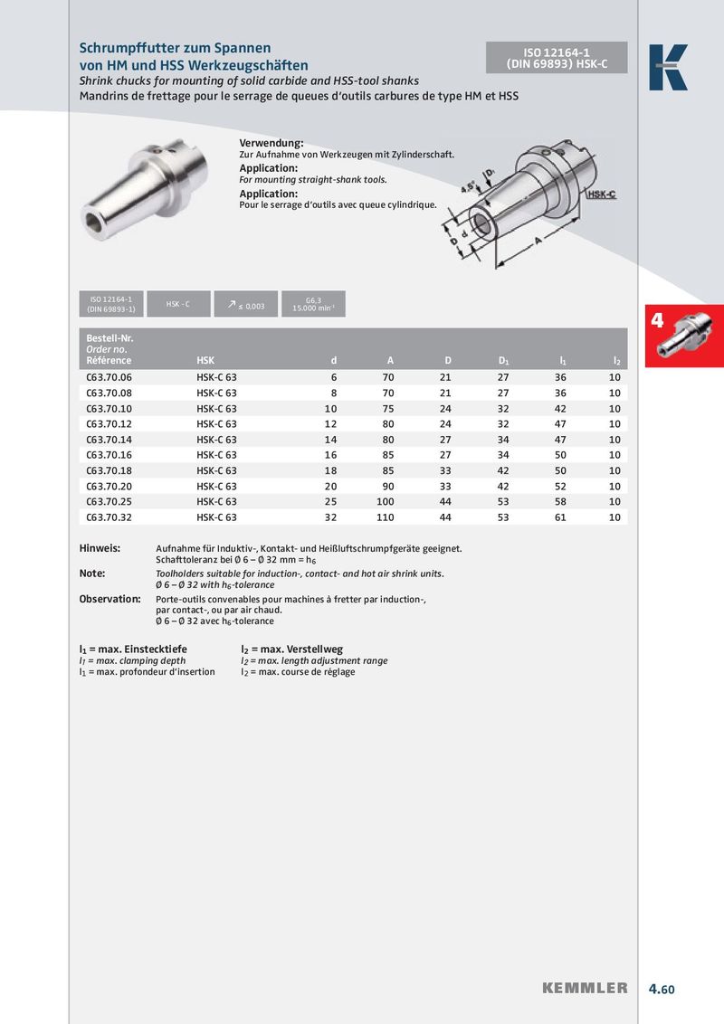 Schrumpffutter zum Spannen ISO 12164-1 von HM und HSS Werkzeugschäften (DIN 69893) HSK-C Shrink chucks for mounting of solid carbide and HSS-tool shanks Mandrins de frettage pour le serrage de queues d‘outils carbures de type HM et HSS Verwendung: Zur Aufnahme von Werkzeugen mit Zylinderschaft. aft. Application: For mounting straight-shank tools. Application: Pour le serrage d’outils avec queue cylindrique. ISO 12164-1 G6,3 HSK - C (DIN 69893-1) k ≤ 0,003 15.000 min -1 4 Bestell-Nr. Order no. Référence HSK d A D D 1 l 1 l 2 C63.70.06 HSK-C 63 6 70 21 27 36 10 C63.70.08 HSK-C 63 8 70 21 27 36 10 C63.70.10 HSK-C 63 10 75 24 32 42 10 C63.70.12 HSK-C 63 12 80 24 32 47 10 C63.70.14 HSK-C 63 14 80 27 34 47 10 C63.70.16 HSK-C 63 16 85 27 34 50 10 C63.70.18 HSK-C 63 18 85 33 42 50 10 C63.70.20 HSK-C 63 20 90 33 42 52 10 C63.70.25 HSK-C 63 25 100 44 53 58 10 C63.70.32 HSK-C 63 32 110 44 53 61 10 Hinweis: Aufnahme für Induktiv-, Kontakt- und Heißluftschrumpfgeräte geeignet. Schafttoleranz bei Ø 6 – Ø 32 mm = h 6 Note: Toolholders suitable for induction-, contact- and hot air shrink units. Ø 6 – Ø 32 with h 6 -tolerance Observation: Porte-outils convenables pour machines à fretter par induction-, par contact-, ou par air chaud. Ø 6 – Ø 32 avec h 6 -tolerance l 1 = max. Einstecktiefe l 2 = max. Verstellweg l 1 = max. clamping depth l 2 = max. length adjustment range l 1 = max. profondeur d’insertion l 2 = max. course de réglage KEMMLER 4.60