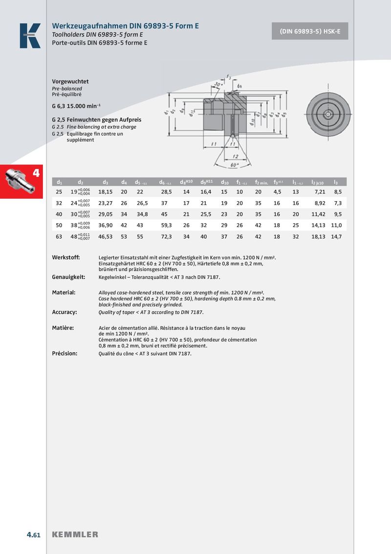 Werkzeugaufnahmen DIN 69893-5 Form E (DIN 69893-5) HSK-E Toolholders DIN 69893-5 form E Porte-outils DIN 69893-5 forme E Vorgewuchtet Pre-balanced Pré-équilibré G 6,3 15.000 min –1 G 2,5 Feinwuchten gegen Aufpreis G 2.5 Fine balancing at extra charge G 2,5 Equilibrage fi n contre un supplément 4 d H11 ±0,1 1 d 2 d 3 d H10 4 d 5 – 0,1 d 6 – 0,1 d 8 d 9 d 10 f 1 – 0,1 f 2 min. f 3 l 1 – 0,2 l 2 js10 l 3 +0,006 25 19 +0,004 18,15 20 22 28,5 14 16,4 15 10 20 4,5 13 7,21 8,5 +0,007 32 24 +0,005 23,27 26 26,5 37 17 21 19 20 35 16 16 8,92 7,3 +0,007 40 30 +0,005 29,05 34 34,8 45 21 25,5 23 20 35 16 20 11,42 9,5 +0,009 50 38 +0,006 36,90 42 43 59,3 26 32 29 26 42 18 25 14,13 11,0 +0,011 63 48 +0,007 46,53 53 55 72,3 34 40 37 26 42 18 32 18,13 14,7 Werkstoff: Legierter Einsatzstahl mit einer Zugfestigkeit im Kern von min. 1200 N / mm². Einsatzgehärtet HRC 60 ± 2 (HV 700 ± 50), Härtetiefe 0,8 mm ± 0,2 mm, brüniert und präzisionsgeschliffen. Genauigkeit: Kegelwinkel – Toleranzqualität < AT 3 nach DIN 7187. Material: Alloyed case-hardened steel, tensile core strength of min. 1200 N / mm². Case hardened HRC 60 ± 2 (HV 700 ± 50), hardening depth 0.8 mm ± 0.2 mm, black-fi nished and precisely grinded. Accuracy: Quality of taper < AT 3 according to DIN 7187. Matière: Acier de cémentation allié. Résistance à la traction dans le noyau de min 1200 N / mm². Cémentation à HRC 60 ± 2 (HV 700 ± 50), profondeur de cémentation 0,8 mm ± 0,2 mm, bruni et rectifié précisement. Précision: Qualité du cône < AT 3 suivant DIN 7187. 4.61 KEMMLER