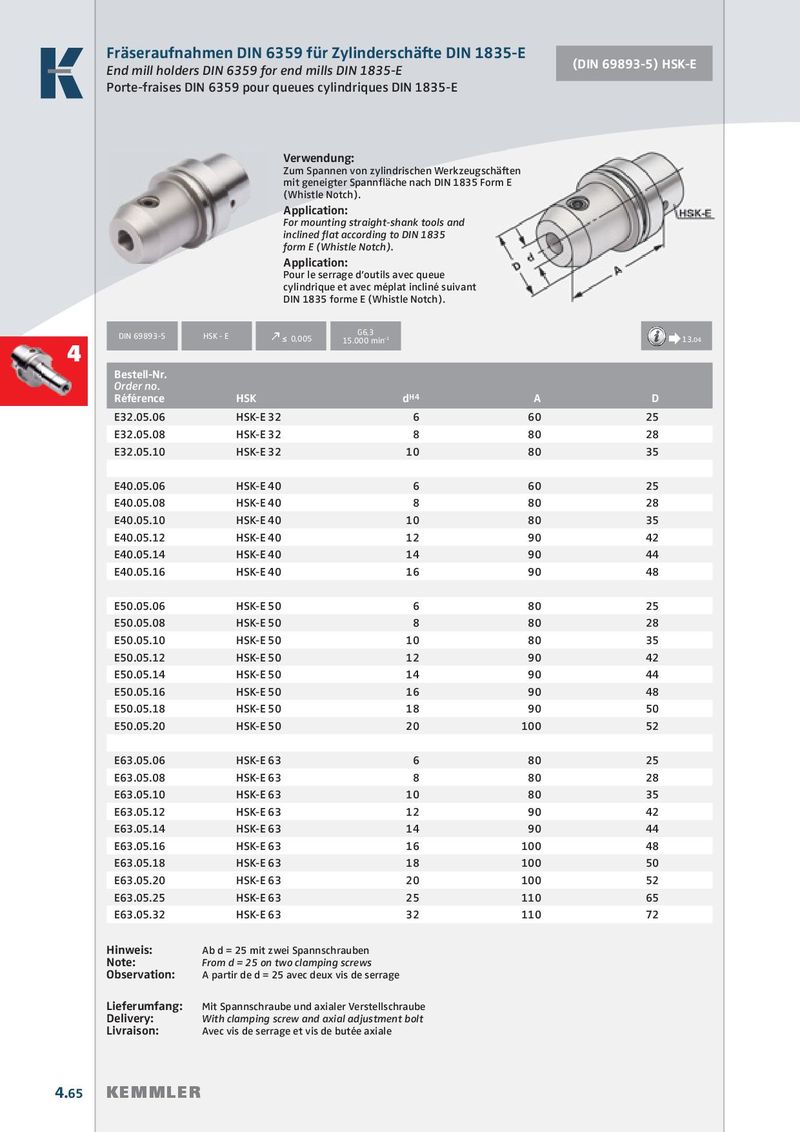 Fräseraufnahmen DIN 6359 für Zylinderschäfte DIN 1835-E (DIN 69893-5) HSK-E End mill holders DIN 6359 for end mills DIN 1835-E Porte-fraises DIN 6359 pour queues cylindriques DIN 1835-E Verwendung: Zum Spannen von zylindrischen Werkzeugschäften mit geneigter Spannfl äche nach DIN 1835 Form E (Whistle Notch). Application: For mounting straight-shank tools and inclined fl at according to DIN 1835 form E (Whistle Notch). Application: Pour le serrage d’outils avec queue cylindrique et avec méplat incliné suivant DIN 1835 forme E (Whistle Notch). G6,3 DIN 69893-5 HSK - E k ≤ 0,005 15.000 min -1 Æ 13.04 4 Bestell-Nr. Order no. Référence HSK d H4 A D E32.05.06 HSK-E 32 6 60 25 E32.05.08 HSK-E 32 8 80 28 E32.05.10 HSK-E 32 10 80 35 E40.05.06 HSK-E 40 6 60 25 E40.05.08 HSK-E 40 8 80 28 E40.05.10 HSK-E 40 10 80 35 E40.05.12 HSK-E 40 12 90 42 E40.05.14 HSK-E 40 14 90 44 E40.05.16 HSK-E 40 16 90 48 E50.05.06 HSK-E 50 6 80 25 E50.05.08 HSK-E 50 8 80 28 E50.05.10 HSK-E 50 10 80 35 E50.05.12 HSK-E 50 12 90 42 E50.05.14 HSK-E 50 14 90 44 E50.05.16 HSK-E 50 16 90 48 E50.05.18 HSK-E 50 18 90 50 E50.05.20 HSK-E 50 20 100 52 E63.05.06 HSK-E 63 6 80 25 E63.05.08 HSK-E 63 8 80 28 E63.05.10 HSK-E 63 10 80 35 E63.05.12 HSK-E 63 12 90 42 E63.05.14 HSK-E 63 14 90 44 E63.05.16 HSK-E 63 16 100 48 E63.05.18 HSK-E 63 18 100 50 E63.05.20 HSK-E 63 20 100 52 E63.05.25 HSK-E 63 25 110 65 E63.05.32 HSK-E 63 32 110 72 Hinweis: Ab d = 25 mit zwei Spannschrauben Note: From d = 25 on two clamping screws Observation: A partir de d = 25 avec deux vis de serrage Lieferumfang: Mit Spannschraube und axialer Verstellschraube Delivery: With clamping screw and axial adjustment bolt Livraison: Avec vis de serrage et vis de butée axiale 4.65 KEMMLER