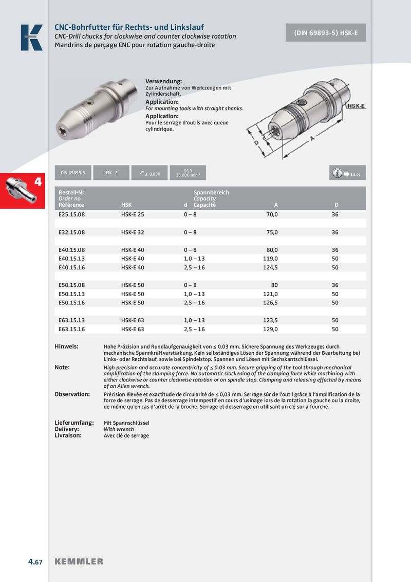 CNC-Bohrfutter für Rechts- und Linkslauf (DIN 69893-5) HSK-E CNC-Drill chucks for clockwise and counter clockwise rotation Mandrins de perçage CNC pour rotation gauche-droite Verwendung: Zur Aufnahme von Werkzeugen mit Zylinderschaft. Application: For mounting tools with straight shanks. Application: Pour le serrage d‘outils avec queue cylindrique. G6,3 DIN 69893-5 HSK - E k ≤ 0,030 15.000 min -1 Æ 13.04 4 Bestell-Nr. Spannbereich Order no. Capacity Référence HSK d Capacité A D E25.15.08 HSK-E 25 0 – 8 70,0 36 E32.15.08 HSK-E 32 0 – 8 75,0 36 E40.15.08 HSK-E 40 0 – 8 80,0 36 E40.15.13 HSK-E 40 1,0 – 13 119,0 50 E40.15.16 HSK-E 40 2,5 – 16 124,5 50 E50.15.08 HSK-E 50 0 – 8 80 36 E50.15.13 HSK-E 50 1,0 – 13 121,0 50 E50.15.16 HSK-E 50 2,5 – 16 126,5 50 E63.15.13 HSK-E 63 1,0 – 13 123,5 50 E63.15.16 HSK-E 63 2,5 – 16 129,0 50 Hinweis: Hohe Präzision und Rundlaufgenauigkeit von ≤ 0,03 mm. Sichere Spannung des Werkzeuges durch mechanische Spannkraft verstärkung. Kein selbständiges Lösen der Spannung während der Bearbeitung bei Links- oder Rechtslauf, sowie bei Spindelstop. Spannen und Lösen mit Sechskantschlüssel. Note: High precision and accurate concentricity of ≤ 0.03 mm. Secure gripping of the tool through mechanical amplifi cation of the clamping force. No automatic slackening of the clamping force while machining with either clockwise or counter clockwise rotation or on spindle stop. Clamping and releasing effected by means of an Allen wrench. Observation: Précision élevée et exactitude de circularité de ≤ 0,03 mm. Serrage sûr de l’outil grâce à l’amplifi cation de la force de serrage. Pas de desserrage intempestif en cours d’usinage lors de la rotation la gauche ou la droite, de même qu’en cas d’arrêt de la broche. Serrage et desserrage en utilisant un clé sur à fourche. Lieferumfang: Mit Spannschlüssel Delivery: With wrench Livraison: Avec clé de serrage 4.67 KEMMLER