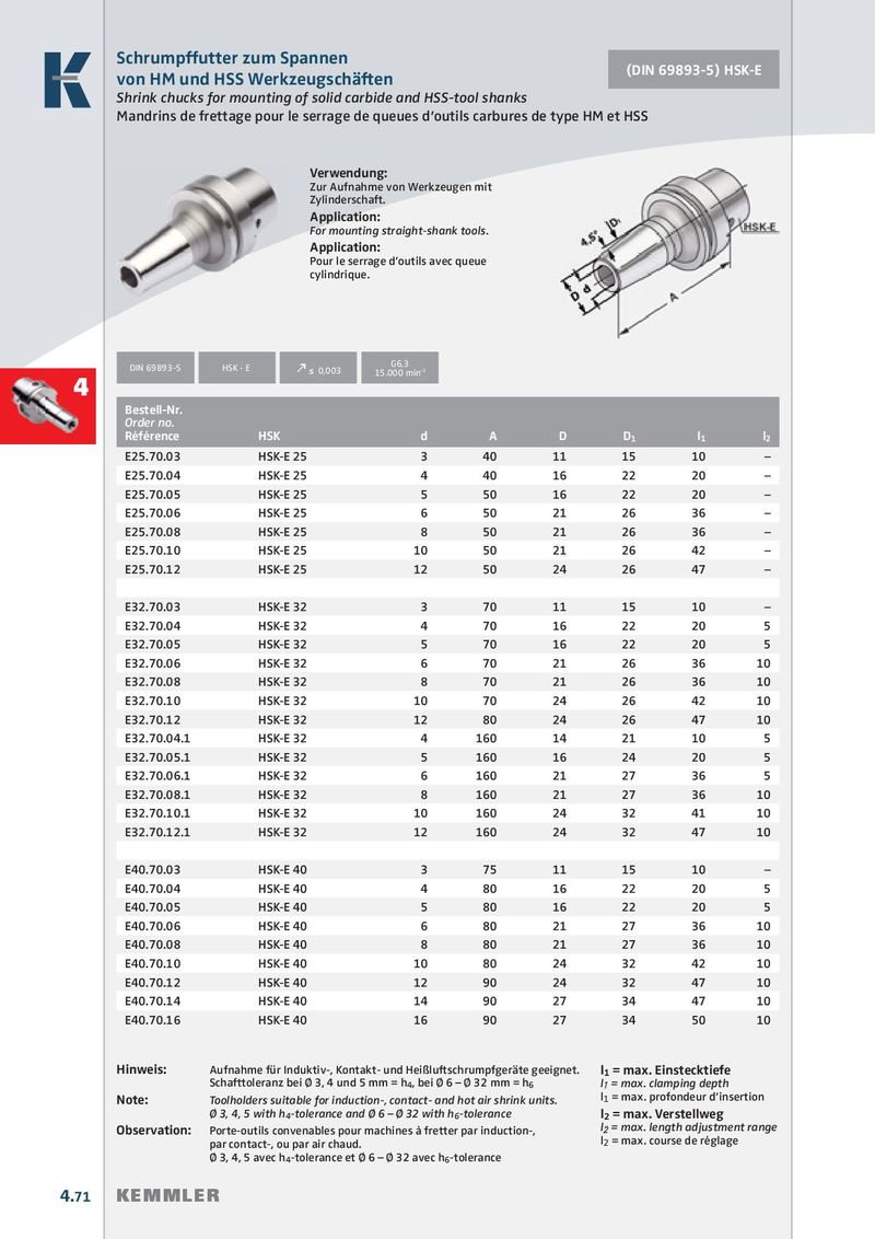 Schrumpffutter zum Spannen (DIN 69893-5) HSK-E von HM und HSS Werkzeugschäften Shrink chucks for mounting of solid carbide and HSS-tool shanks Mandrins de frettage pour le serrage de queues d‘outils carbures de type HM et HSS Verwendung: Zur Aufnahme von Werkzeugen mit Zylinderschaft. Application: For mounting straight-shank tools. Application: Pour le serrage d’outils avec queue cylindrique. G6,3 DIN 69893-5 HSK - E k ≤ 0,003 15.000 min -1 4 Bestell-Nr. Order no. Référence HSK d A D D 1 l 1 l 2 E25.70.03 HSK-E 25 3 40 11 15 10 – E25.70.04 HSK-E 25 4 40 16 22 20 – E25.70.05 HSK-E 25 5 50 16 22 20 – E25.70.06 HSK-E 25 6 50 21 26 36 – E25.70.08 HSK-E 25 8 50 21 26 36 – E25.70.10 HSK-E 25 10 50 21 26 42 – E25.70.12 HSK-E 25 12 50 24 26 47 – E32.70.03 HSK-E 32 3 70 11 15 10 – E32.70.04 HSK-E 32 4 70 16 22 20 5 E32.70.05 HSK-E 32 5 70 16 22 20 5 E32.70.06 HSK-E 32 6 70 21 26 36 10 E32.70.08 HSK-E 32 8 70 21 26 36 10 E32.70.10 HSK-E 32 10 70 24 26 42 10 E32.70.12 HSK-E 32 12 80 24 26 47 10 E32.70.04.1 HSK-E 32 4 160 14 21 10 5 E32.70.05.1 HSK-E 32 5 160 16 24 20 5 E32.70.06.1 HSK-E 32 6 160 21 27 36 5 E32.70.08.1 HSK-E 32 8 160 21 27 36 10 E32.70.10.1 HSK-E 32 10 160 24 32 41 10 E32.70.12.1 HSK-E 32 12 160 24 32 47 10 E40.70.03 HSK-E 40 3 75 11 15 10 – E40.70.04 HSK-E 40 4 80 16 22 20 5 E40.70.05 HSK-E 40 5 80 16 22 20 5 E40.70.06 HSK-E 40 6 80 21 27 36 10 E40.70.08 HSK-E 40 8 80 21 27 36 10 E40.70.10 HSK-E 40 10 80 24 32 42 10 E40.70.12 HSK-E 40 12 90 24 32 47 10 E40.70.14 HSK-E 40 14 90 27 34 47 10 E40.70.16 HSK-E 40 16 90 27 34 50 10 Hinweis: Aufnahme für Induktiv-, Kontakt- und Heißluftschrumpfgeräte geeignet. l 1 = max. Einstecktiefe Schafttoleranz bei Ø 3, 4 und 5 mm = h 4 , bei Ø 6 – Ø 32 mm = h 6 l 1 = max. clamping depth Note: Toolholders suitable for induction-, contact- and hot air shrink units. l 1 = max. profondeur d’insertion Ø 3, 4, 5 with h 4 -tolerance and Ø 6 – Ø 32 with h 6 -tolerance l 2 = max. Verstellweg Observation: Porte-outils convenables pour machines à fretter par induction-, l 2 = max. length adjustment range par contact-, ou par air chaud. l 2 = max. course de réglage Ø 3, 4, 5 avec h 4 -tolerance et Ø 6 – Ø 32 avec h 6 -tolerance 4.71 KEMMLER