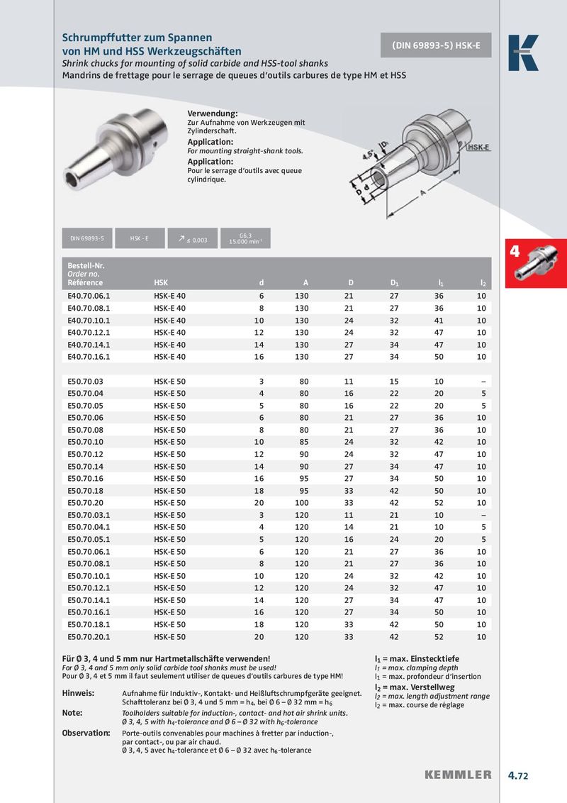 Schrumpffutter zum Spannen (DIN 69893-5) HSK-E von HM und HSS Werkzeugschäften Shrink chucks for mounting of solid carbide and HSS-tool shanks Mandrins de frettage pour le serrage de queues d‘outils carbures de type HM et HSS Verwendung: Zur Aufnahme von Werkzeugen mit Zylinderschaft. Application: For mounting straight-shank tools. Application: Pour le serrage d’outils avec queue cylindrique. G6,3 DIN 69893-5 HSK - E k ≤ 0,003 15.000 min -1 4 Bestell-Nr. Order no. Référence HSK d A D D 1 l 1 l 2 E40.70.06.1 HSK-E 40 6 130 21 27 36 10 E40.70.08.1 HSK-E 40 8 130 21 27 36 10 E40.70.10.1 HSK-E 40 10 130 24 32 41 10 E40.70.12.1 HSK-E 40 12 130 24 32 47 10 E40.70.14.1 HSK-E 40 14 130 27 34 47 10 E40.70.16.1 HSK-E 40 16 130 27 34 50 10 E50.70.03 HSK-E 50 3 80 11 15 10 – E50.70.04 HSK-E 50 4 80 16 22 20 5 E50.70.05 HSK-E 50 5 80 16 22 20 5 E50.70.06 HSK-E 50 6 80 21 27 36 10 E50.70.08 HSK-E 50 8 80 21 27 36 10 E50.70.10 HSK-E 50 10 85 24 32 42 10 E50.70.12 HSK-E 50 12 90 24 32 47 10 E50.70.14 HSK-E 50 14 90 27 34 47 10 E50.70.16 HSK-E 50 16 95 27 34 50 10 E50.70.18 HSK-E 50 18 95 33 42 50 10 E50.70.20 HSK-E 50 20 100 33 42 52 10 E50.70.03.1 HSK-E 50 3 120 11 21 10 – E50.70.04.1 HSK-E 50 4 120 14 21 10 5 E50.70.05.1 HSK-E 50 5 120 16 24 20 5 E50.70.06.1 HSK-E 50 6 120 21 27 36 10 E50.70.08.1 HSK-E 50 8 120 21 27 36 10 E50.70.10.1 HSK-E 50 10 120 24 32 42 10 E50.70.12.1 HSK-E 50 12 120 24 32 47 10 E50.70.14.1 HSK-E 50 14 120 27 34 47 10 E50.70.16.1 HSK-E 50 16 120 27 34 50 10 E50.70.18.1 HSK-E 50 18 120 33 42 50 10 E50.70.20.1 HSK-E 50 20 120 33 42 52 10 Für Ø 3, 4 und 5 mm nur Hartmetallschäfte verwenden! l 1 = max. Einstecktiefe For Ø 3, 4 and 5 mm only solid carbide tool shanks must be used! l 1 = max. clamping depth Pour Ø 3, 4 et 5 mm il faut seulement utiliser de queues d‘outils carbures de type HM! l 1 = max. profondeur d’insertion l 2 = max. Verstellweg Hinweis: Aufnahme für Induktiv-, Kontakt- und Heißluftschrumpfgeräte geeignet. l 2 = max. length adjustment range Schafttoleranz bei Ø 3, 4 und 5 mm = h 4 , bei Ø 6 – Ø 32 mm = h 6 l 2 = max. course de réglage Note: Toolholders suitable for induction-, contact- and hot air shrink units. Ø 3, 4, 5 with h 4 -tolerance and Ø 6 – Ø 32 with h 6 -tolerance Observation: Porte-outils convenables pour machines à fretter par induction-, par contact-, ou par air chaud. Ø 3, 4, 5 avec h 4 -tolerance et Ø 6 – Ø 32 avec h 6 -tolerance KEMMLER 4.72