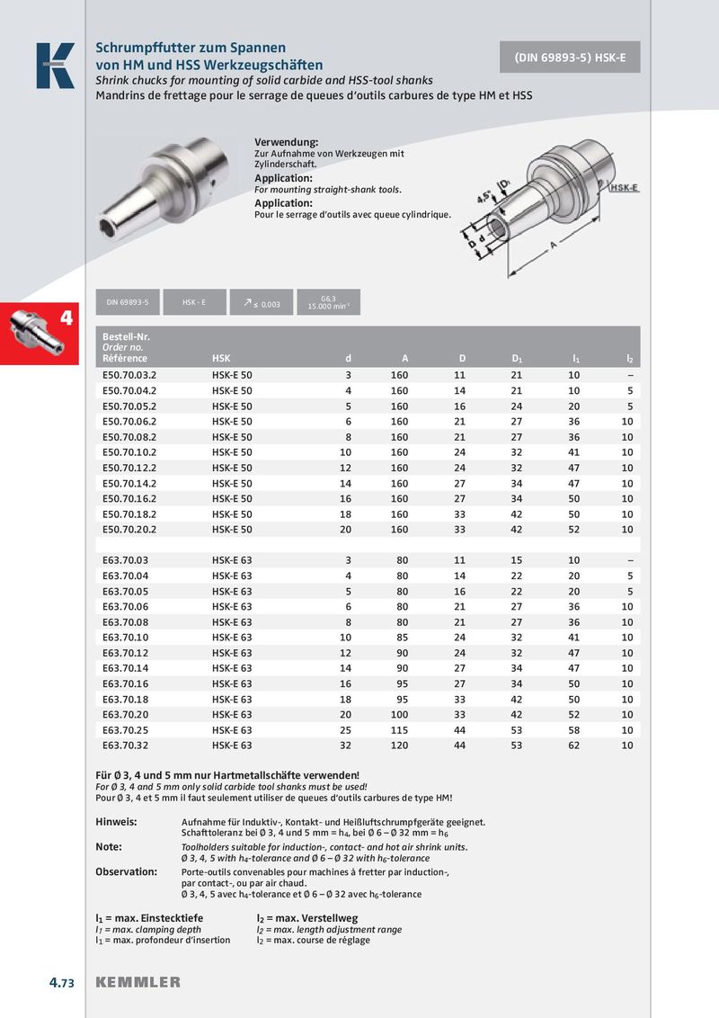 Schrumpffutter zum Spannen (DIN 69893-5) HSK-E von HM und HSS Werkzeugschäften Shrink chucks for mounting of solid carbide and HSS-tool shanks Mandrins de frettage pour le serrage de queues d‘outils carbures de type HM et HSS Verwendung: Zur Aufnahme von Werkzeugen mit Zylinderschaft. Application: For mounting straight-shank tools. Application: Pour le serrage d’outils avec queue cylindrique. G6,3 DIN 69893-5 HSK - E k ≤ 0,003 15.000 min -1 4 Bestell-Nr. Order no. Référence HSK d A D D 1 l 1 l 2 E50.70.03.2 HSK-E 50 3 160 11 21 10 – E50.70.04.2 HSK-E 50 4 160 14 21 10 5 E50.70.05.2 HSK-E 50 5 160 16 24 20 5 E50.70.06.2 HSK-E 50 6 160 21 27 36 10 E50.70.08.2 HSK-E 50 8 160 21 27 36 10 E50.70.10.2 HSK-E 50 10 160 24 32 41 10 E50.70.12.2 HSK-E 50 12 160 24 32 47 10 E50.70.14.2 HSK-E 50 14 160 27 34 47 10 E50.70.16.2 HSK-E 50 16 160 27 34 50 10 E50.70.18.2 HSK-E 50 18 160 33 42 50 10 E50.70.20.2 HSK-E 50 20 160 33 42 52 10 E63.70.03 HSK-E 63 3 80 11 15 10 – E63.70.04 HSK-E 63 4 80 14 22 20 5 E63.70.05 HSK-E 63 5 80 16 22 20 5 E63.70.06 HSK-E 63 6 80 21 27 36 10 E63.70.08 HSK-E 63 8 80 21 27 36 10 E63.70.10 HSK-E 63 10 85 24 32 41 10 E63.70.12 HSK-E 63 12 90 24 32 47 10 E63.70.14 HSK-E 63 14 90 27 34 47 10 E63.70.16 HSK-E 63 16 95 27 34 50 10 E63.70.18 HSK-E 63 18 95 33 42 50 10 E63.70.20 HSK-E 63 20 100 33 42 52 10 E63.70.25 HSK-E 63 25 115 44 53 58 10 E63.70.32 HSK-E 63 32 120 44 53 62 10 Für Ø 3, 4 und 5 mm nur Hartmetallschäfte verwenden! For Ø 3, 4 and 5 mm only solid carbide tool shanks must be used! Pour Ø 3, 4 et 5 mm il faut seulement utiliser de queues d‘outils carbures de type HM! Hinweis: Aufnahme für Induktiv-, Kontakt- und Heißluftschrumpfgeräte geeignet. Schafttoleranz bei Ø 3, 4 und 5 mm = h 4 , bei Ø 6 – Ø 32 mm = h 6 Note: Toolholders suitable for induction-, contact- and hot air shrink units. Ø 3, 4, 5 with h 4 -tolerance and Ø 6 – Ø 32 with h 6 -tolerance Observation: Porte-outils convenables pour machines à fretter par induction-, par contact-, ou par air chaud. Ø 3, 4, 5 avec h 4 -tolerance et Ø 6 – Ø 32 avec h 6 -tolerance l 1 = max. Einstecktiefe l 2 = max. Verstellweg l 1 = max. clamping depth l 2 = max. length adjustment range l 1 = max. profondeur d’insertion l 2 = max. course de réglage 4.73 KEMMLER