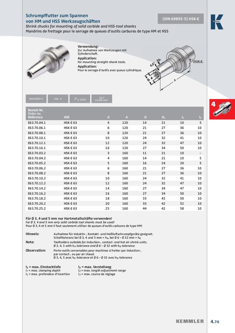 Schrumpffutter zum Spannen (DIN 69893-5) HSK-E von HM und HSS Werkzeugschäften Shrink chucks for mounting of solid carbide and HSS-tool shanks Mandrins de frettage pour le serrage de queues d‘outils carbures de type HM et HSS Verwendung: Zur Aufnahme von Werkzeugen mit Zylinderschaft. Application: For mounting straight-shank tools. Application: Pour le serrage d’outils avec queue cylindrique. G6,3 DIN 69893-5 HSK - E k ≤ 0,003 15.000 min -1 4 Bestell-Nr. Order no. Référence HSK d A D D 1 l 1 l 2 E63.70.04.1 HSK-E 63 4 120 14 21 10 5 E63.70.06.1 HSK-E 63 6 120 21 27 36 10 E63.70.08.1 HSK-E 63 8 120 21 27 36 10 E63.70.10.1 HSK-E 63 10 120 24 32 41 10 E63.70.12.1 HSK-E 63 12 120 24 32 47 10 E63.70.16.1 HSK-E 63 16 120 27 34 50 10 E63.70.03.2 HSK-E 63 3 160 11 21 10 – E63.70.04.2 HSK-E 63 4 160 14 21 10 5 E63.70.05.2 HSK-E 63 5 160 16 24 20 5 E63.70.06.2 HSK-E 63 6 160 21 27 36 10 E63.70.08.2 HSK-E 63 8 160 21 27 36 10 E63.70.10.2 HSK-E 63 10 160 24 32 41 10 E63.70.12.2 HSK-E 63 12 160 24 32 47 10 E63.70.14.2 HSK-E 63 14 160 27 34 47 10 E63.70.16.2 HSK-E 63 16 160 27 34 50 10 E63.70.18.2 HSK-E 63 18 160 33 42 50 10 E63.70.20.2 HSK-E 63 20 160 33 42 52 10 E63.70.25.2 HSK-E 63 25 160 44 42 58 10 Für Ø 3, 4 und 5 mm nur Hartmetallschäfte verwenden! For Ø 3, 4 and 5 mm only solid carbide tool shanks must be used! Pour Ø 3, 4 et 5 mm il faut seulement utiliser de queues d‘outils carbures de type HM! Hinweis: Aufnahme für Induktiv-, Kontakt- und Heißluftschrumpfgeräte geeignet. Schafttoleranz bei Ø 3, 4 und 5 mm = h 4 , bei Ø 6 – Ø 32 mm = h 6 Note: Toolholders suitable for induction-, contact- and hot air shrink units. Ø 3, 4, 5 with h 4 -tolerance and Ø 6 – Ø 32 with h 6 -tolerance Observation: Porte-outils convenables pour machines à fretter par induction-, par contact-, ou par air chaud. Ø 3, 4, 5 avec h 4 -tolerance et Ø 6 – Ø 32 avec h 6 -tolerance l 1 = max. Einstecktiefe l 2 = max. Verstellweg l 1 = max. clamping depth l 2 = max. length adjustment range l 1 = max. profondeur d’insertion l 2 = max. course de réglage KEMMLER 4.74