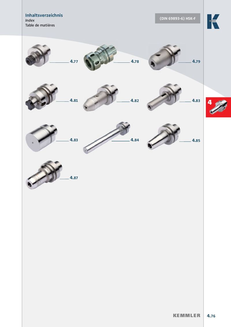 Inhaltsverzeichnis (DIN 69893-6) HSK-F Index Table de matières 4.77 4.79 4.78 4.81 4.83 4.82 4 4.84 4 4.83 4.85 4.87 KEMMLER 4.76