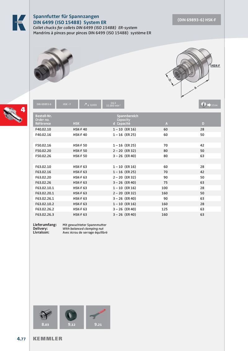 Spannfutter für Spannzangen (DIN 69893-6) HSK-F DIN 6499 (ISO 15488) System ER Collet chucks for collets DIN 6499 (ISO 15488) ER-system Mandrins à pinces pour pinces DIN 6499 (ISO 15488) système ER G6,3 DIN 69893-6 HSK - F k ≤ 0,003 15.000 min -1 Æ 13.04 4 Bestell-Nr. Spannbereich Order no. Capacity Référence HSK d Capacité A D F40.02.10 HSK-F 40 1 – 10 (ER 16) 60 28 F40.02.16 HSK-F 40 1 – 16 (ER 25) 60 50 F50.02.16 HSK-F 50 1 – 16 (ER 25) 70 42 F50.02.20 HSK-F 50 2 – 20 (ER 32) 80 50 F50.02.26 HSK-F 50 3 – 26 (ER 40) 80 63 F63.02.10 HSK-F 63 1 – 10 (ER 16) 60 28 F63.02.16 HSK-F 63 1 – 16 (ER 25) 70 42 F63.02.20 HSK-F 63 2 – 20 (ER 32) 90 50 F63.02.26 HSK-F 63 3 – 26 (ER 40) 75 63 F63.02.10.1 HSK-F 63 1 – 10 (ER 16) 100 28 F63.02.20.1 HSK-F 63 2 – 20 (ER 32) 160 50 F63.02.26.1 HSK-F 63 3 – 26 (ER 40) 90 63 F63.02.10.2 HSK-F 63 1 – 10 (ER 16) 160 28 F63.02.26.2 HSK-F 63 3 – 26 (ER 40) 125 63 F63.02.26.3 HSK-F 63 3 – 26 (ER 40) 160 63 Lieferumfang: Mit gewuchteter Spannmutter Delivery: With balanced clamping nut Livraison: Avec écrou de serrage équilibré 8.03 9.12 9.21 4.77 KEMMLER