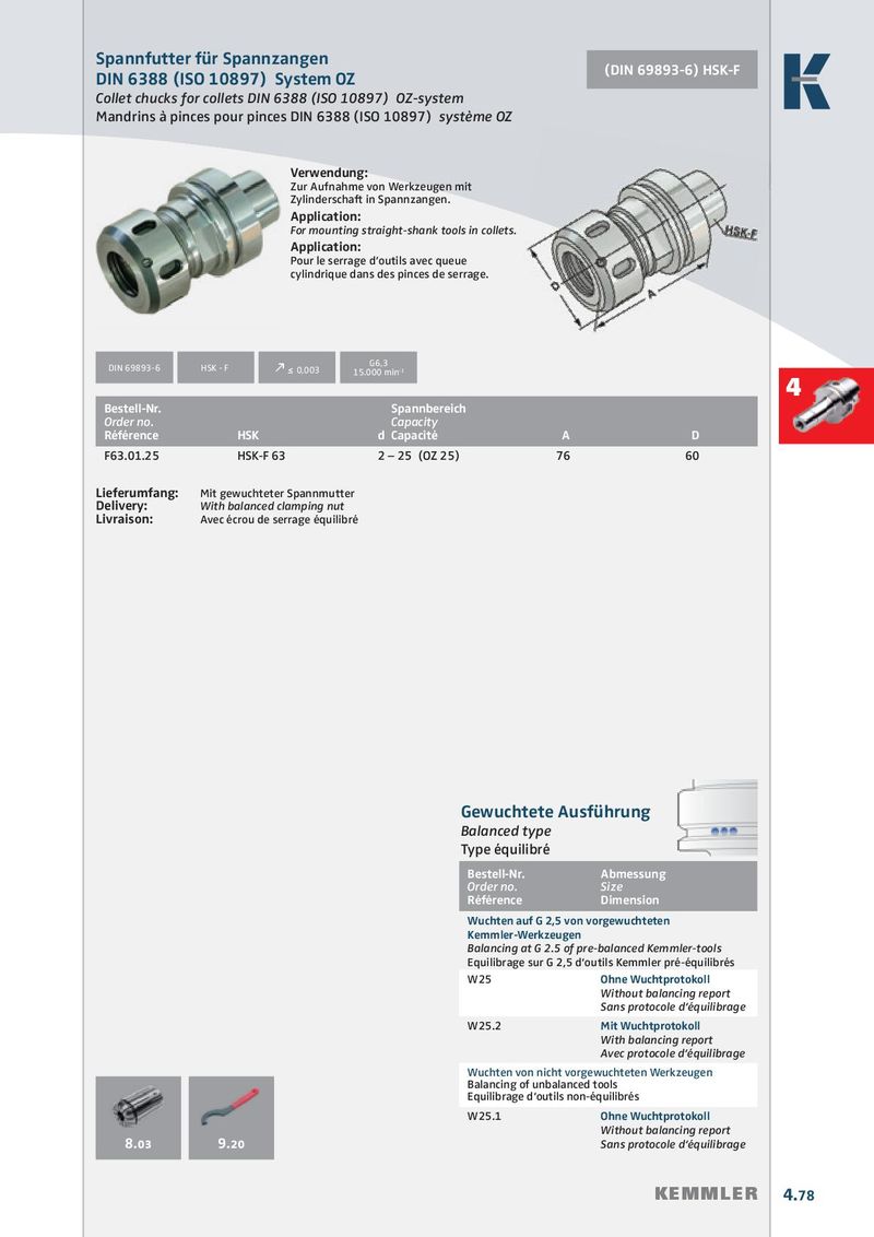 Spannfutter für Spannzangen (DIN 69893-6) HSK-F DIN 6388 (ISO 10897) System OZ Collet chucks for collets DIN 6388 (ISO 10897) OZ-system Mandrins à pinces pour pinces DIN 6388 (ISO 10897) système OZ Verwendung: Zur Aufnahme von Werkzeugen mit Zylinderschaft in Spannzangen. Application: For mounting straight-shank tools in collets. Application: Pour le serrage d’outils avec queue cylindrique dans des pinces de serrage. G6,3 DIN 69893-6 HSK - F k ≤ 0,003 15.000 min -1 4 Bestell-Nr. Spannbereich Order no. Capacity Référence HSK d Capacité A D F63.01.25 HSK-F 63 2 – 25 (OZ 25) 76 60 Lieferumfang: Mit gewuchteter Spannmutter Delivery: With balanced clamping nut Livraison: Avec écrou de serrage équilibré Gewuchtete Ausführung Balanced type Type équilibré Bestell-Nr. Abmessung Order no. Size Référence Dimension Wuchten auf G 2,5 von vorgewuchteten Kemmler-Werkzeugen Balancing at G 2.5 of pre-balanced Kemmler-tools Equilibrage sur G 2,5 d‘outils Kemmler pré-équilibrés W25 Ohne Wuchtprotokoll Without balancing report Sans protocole d‘équilibrage W25.2 Mit Wuchtprotokoll With balancing report Avec protocole d‘équilibrage Wuchten von nicht vorgewuchteten Werkzeugen Balancing of unbalanced tools Equilibrage d‘outils non-équilibrés W25.1 Ohne Wuchtprotokoll Without balancing report 8.03 9.20 Sans protocole d‘équilibrage KEMMLER 4.78