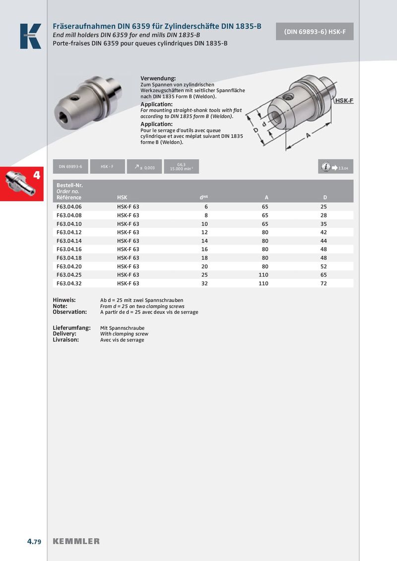 Fräseraufnahmen DIN 6359 für Zylinderschäfte DIN 1835-B (DIN 69893-6) HSK-F End mill holders DIN 6359 for end mills DIN 1835-B Porte-fraises DIN 6359 pour queues cylindriques DIN 1835-B Verwendung: Zum Spannen von zylindrischen Werkzeugschäften mit seitlicher Spannfläche nach DIN 1835 Form B (Weldon). Application: For mounting straight-shank tools with flat according to DIN 1835 form B (Weldon). Application: Pour le serrage d’outils avec queue cylindrique et avec méplat suivant DIN 1835 forme B (Weldon). G6,3 DIN 69893-6 HSK - F k ≤ 0,003 15.000 min -1 Æ 13.04 4 Bestell-Nr. Order no. Référence HSK d H4 A D F63.04.06 HSK-F 63 6 65 25 F63.04.08 HSK-F 63 8 65 28 F63.04.10 HSK-F 63 10 65 35 F63.04.12 HSK-F 63 12 80 42 F63.04.14 HSK-F 63 14 80 44 F63.04.16 HSK-F 63 16 80 48 F63.04.18 HSK-F 63 18 80 48 F63.04.20 HSK-F 63 20 80 52 F63.04.25 HSK-F 63 25 110 65 F63.04.32 HSK-F 63 32 110 72 Hinweis: Ab d = 25 mit zwei Spannschrauben Note: From d = 25 on two clamping screws Observation: A partir de d = 25 avec deux vis de serrage Lieferumfang: Mit Spannschraube Delivery: With clamping screw Livraison: Avec vis de serrage 4.79 KEMMLER