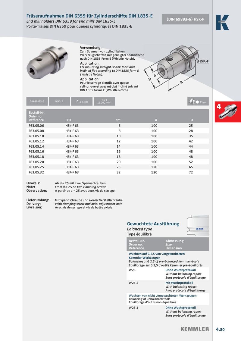 Fräseraufnahmen DIN 6359 für Zylinderschäfte DIN 1835-E (DIN 69893-6) HSK-F End mill holders DIN 6359 for end mills DIN 1835-E Porte-fraises DIN 6359 pour queues cylindriques DIN 1835-E Verwendung: Zum Spannen von zylindrischen Werkzeugschäften mit geneigter Spannfläche nach DIN 1835 Form E (Whistle Notch). Application: For mounting straight-shank tools and inclined fl at according to DIN 1835 form E (Whistle Notch). Application: Pour le serrage d’outils avec queue cylindrique et avec méplat incliné suivant DIN 1835 forme E (Whistle Notch). G6,3 DIN 69893-6 HSK - F k ≤ 0,003 15.000 min -1 Æ 13.04 4 Bestell-Nr. Order no. Référence HSK d H4 A D F63.05.06 HSK-F 63 6 100 25 F63.05.08 HSK-F 63 8 100 28 F63.05.10 HSK-F 63 10 100 35 F63.05.12 HSK-F 63 12 100 42 F63.05.14 HSK-F 63 14 100 44 F63.05.16 HSK-F 63 16 100 48 F63.05.18 HSK-F 63 18 100 48 F63.05.20 HSK-F 63 20 100 52 F63.05.25 HSK-F 63 25 120 65 F63.05.32 HSK-F 63 32 120 72 Hinweis: Ab d = 25 mit zwei Spannschrauben Note: From d = 25 on two clamping screws Observation: A partir de d = 25 avec deux vis de serrage Lieferumfang: Mit Spannschraube und axialer Verstellschraube Delivery: With clamping screw and axial adjustment bolt Livraison: Avec vis de serrage et vis de butée axiale Gewuchtete Ausführung Balanced type Type équilibré Bestell-Nr. Abmessung Order no. Size Référence Dimension Wuchten auf G 2,5 von vorgewuchteten Kemmler-Werkzeugen Balancing at G 2.5 of pre-balanced Kemmler-tools Equilibrage sur G 2,5 d‘outils Kemmler pré-équilibrés W25 Ohne Wuchtprotokoll Without balancing report Sans protocole d‘équilibrage W25.2 Mit Wuchtprotokoll With balancing report Avec protocole d‘équilibrage Wuchten von nicht vorgewuchteten Werkzeugen Balancing of unbalanced tools Equilibrage d‘outils non-équilibrés W25.1 Ohne Wuchtprotokoll Without balancing report Sans protocole d‘équilibrage KEMMLER 4.80