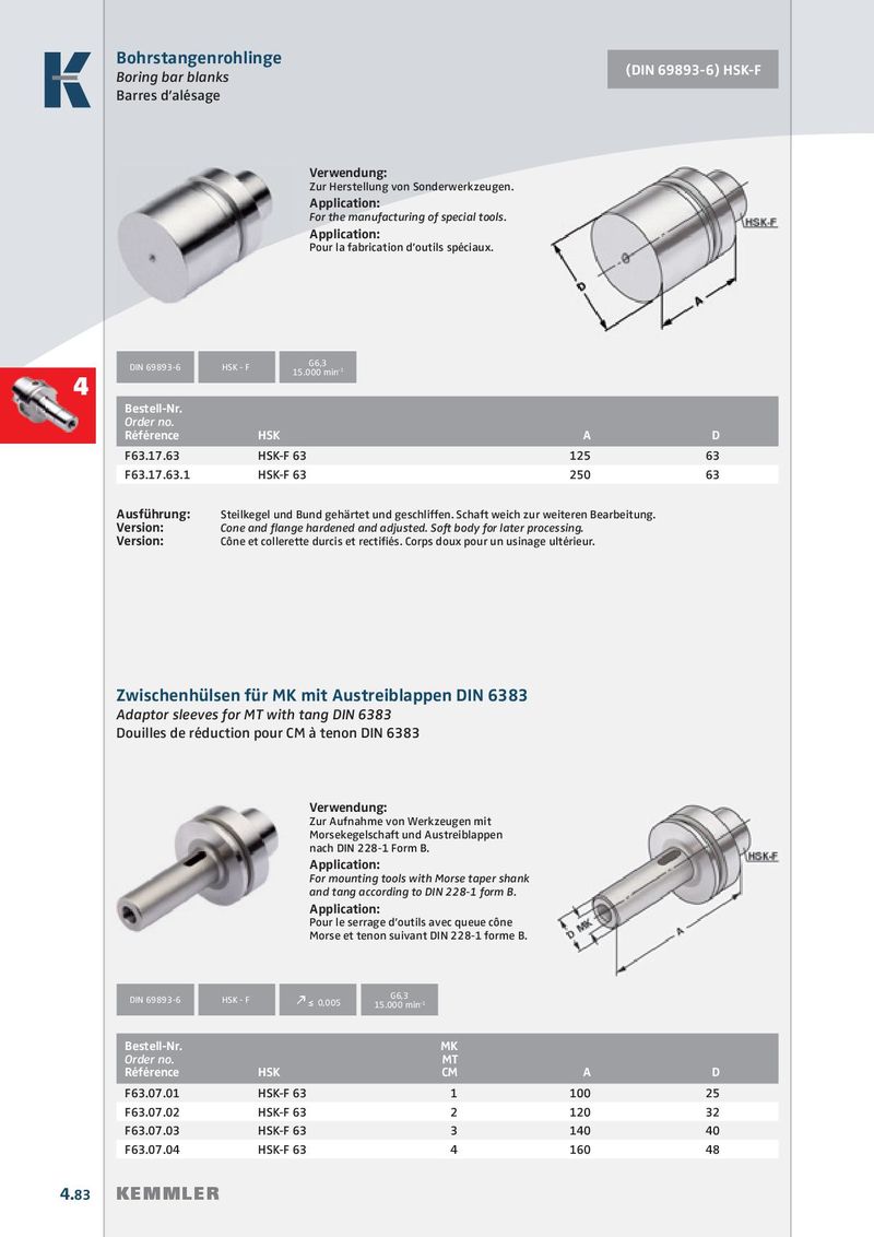 Bohrstangenrohlinge (DIN 69893-6) HSK-F Boring bar blanks Barres d’alésage Verwendung: Zur Herstellung von Sonderwerkzeugen. Application: For the manufacturing of special tools. Application: Pour la fabrication d’outils spéciaux. G6,3 DIN 69893-6 HSK - F 15.000 min -1 4 Bestell-Nr. Order no. Référence HSK A D F63.17.63 HSK-F 63 125 63 F63.17.63.1 HSK-F 63 250 63 Ausführung: Steilkegel und Bund gehärtet und geschliffen. Schaft weich zur weiteren Bearbeitung. Version: Cone and fl ange hardened and adjusted. Soft body for later processing. Version: Cône et collerette durcis et rectifi és. Corps doux pour un usinage ultérieur. Zwischenhülsen für MK mit Austreiblappen DIN 6383 Adaptor sleeves for MT with tang DIN 6383 Douilles de réduction pour CM à tenon DIN 6383 Verwendung: Zur Aufnahme von Werkzeugen mit Morsekegelschaft und Austreiblappen nach DIN 228-1 Form B. Application: For mounting tools with Morse taper shank and tang according to DIN 228-1 form B. Application: Pour le serrage d’outils avec queue cône Morse et tenon suivant DIN 228-1 forme B. G6,3 DIN 69893-6 HSK - F k ≤ 0,005 15.000 min -1 Bestell-Nr. MK Order no. MT Référence HSK CM A D F63.07.01 HSK-F 63 1 100 25 F63.07.02 HSK-F 63 2 120 32 F63.07.03 HSK-F 63 3 140 40 F63.07.04 HSK-F 63 4 160 48 4.83 KEMMLER