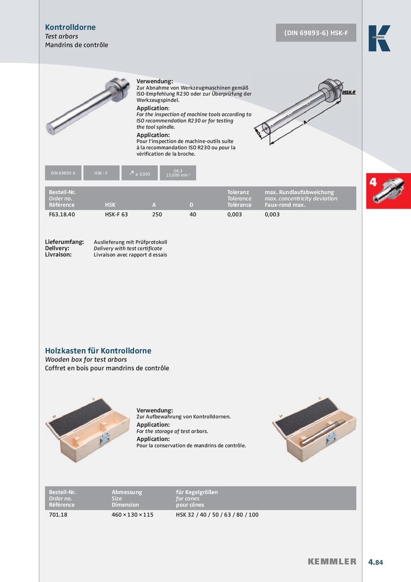 Kontrolldorne (DIN 69893-6) HSK-F Test arbors Mandrins de contrôle Verwendung: Zur Abnahme von Werkzeugmaschinen gemäß ISO-Empfehlung R230 oder zur Überprüfung der Werkzeugspindel. Application: For the inspection of machine tools according to ISO recommendation R230 or for testing the tool spindle. Application: Pour l‘inspection de machine-outils suite à la recommandation ISO R230 ou pour la vérifi cation de la broche. G6,3 DIN 69893-6 HSK - F k ≤ 0,003 15.000 min -1 4 Bestell-Nr. Toleranz max. Rundlaufabweichung Order no. Tolerance max. concentricity deviation Référence HSK A D Tolérance Faux-rond max. F63.18.40 HSK-F 63 250 40 0,003 0,003 Lieferumfang: Auslieferung mit Prüfprotokoll Delivery: Delivery with test certificate Livraison: Livraison avec rapport d essais Holzkasten für Kontrolldorne Wooden box for test arbors Coffret en bois pour mandrins de contrôle Verwendung: Zur Aufbewahrung von Kontrolldornen. Application: For the storage of test arbors. Application: Pour la conservation de mandrins de contrôle. Bestell-Nr. Abmessung für Kegelgrößen Order no. Size for cones Référence Dimension pour cônes 701.18 460 × 130 × 115 HSK 32 / 40 / 50 / 63 / 80 / 100 KEMMLER 4.84
