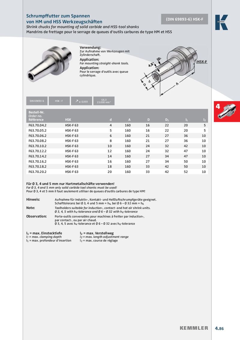 Schrumpffutter zum Spannen (DIN 69893-6) HSK-F von HM und HSS Werkzeugschäften Shrink chucks for mounting of solid carbide and HSS-tool shanks Mandrins de frettage pour le serrage de queues d‘outils carbures de type HM et HSS Verwendung: Zur Aufnahme von Werkzeugen mit Zylinderschaft. Application: For mounting straight-shank tools. Application: Pour le serrage d’outils avec queue cylindrique. G6,3 DIN 69893-6 HSK - F k ≤ 0,003 15.000 min -1 4 Bestell-Nr. Order no. Référence HSK d A D D 1 l 1 l 2 F63.70.04.2 HSK-F 63 4 160 16 22 20 5 F63.70.05.2 HSK-F 63 5 160 16 22 20 5 F63.70.06.2 HSK-F 63 6 160 21 27 36 10 F63.70.08.2 HSK-F 63 8 160 21 27 36 10 F63.70.10.2 HSK-F 63 10 160 24 32 42 10 F63.70.12.2 HSK-F 63 12 160 24 32 47 10 F63.70.14.2 HSK-F 63 14 160 27 34 47 10 F63.70.16.2 HSK-F 63 16 160 27 34 50 10 F63.70.18.2 HSK-F 63 18 160 33 42 50 10 F63.70.20.2 HSK-F 63 20 160 33 42 52 10 Für Ø 3, 4 und 5 mm nur Hartmetallschäfte verwenden! For Ø 3, 4 and 5 mm only solid carbide tool shanks must be used! Pour Ø 3, 4 et 5 mm il faut seulement utiliser de queues d‘outils carbures de type HM! Hinweis: Aufnahme für Induktiv-, Kontakt- und Heißluftschrumpfgeräte geeignet. Schafttoleranz bei Ø 3, 4 und 5 mm = h 4 , bei Ø 6 – Ø 32 mm = h 6 Note: Toolholders suitable for induction-, contact- and hot air shrink units. Ø 3, 4, 5 with h 4 -tolerance and Ø 6 – Ø 32 with h 6 -tolerance Observation: Porte-outils convenables pour machines à fretter par induction-, par contact-, ou par air chaud. Ø 3, 4, 5 avec h 4 -tolerance et Ø 6 – Ø 32 avec h 6 -tolerance l 1 = max. Einstecktiefe l 2 = max. Verstellweg l 1 = max. clamping depth l 2 = max. length adjustment range l 1 = max. profondeur d’insertion l 2 = max. course de réglage KEMMLER 4.86