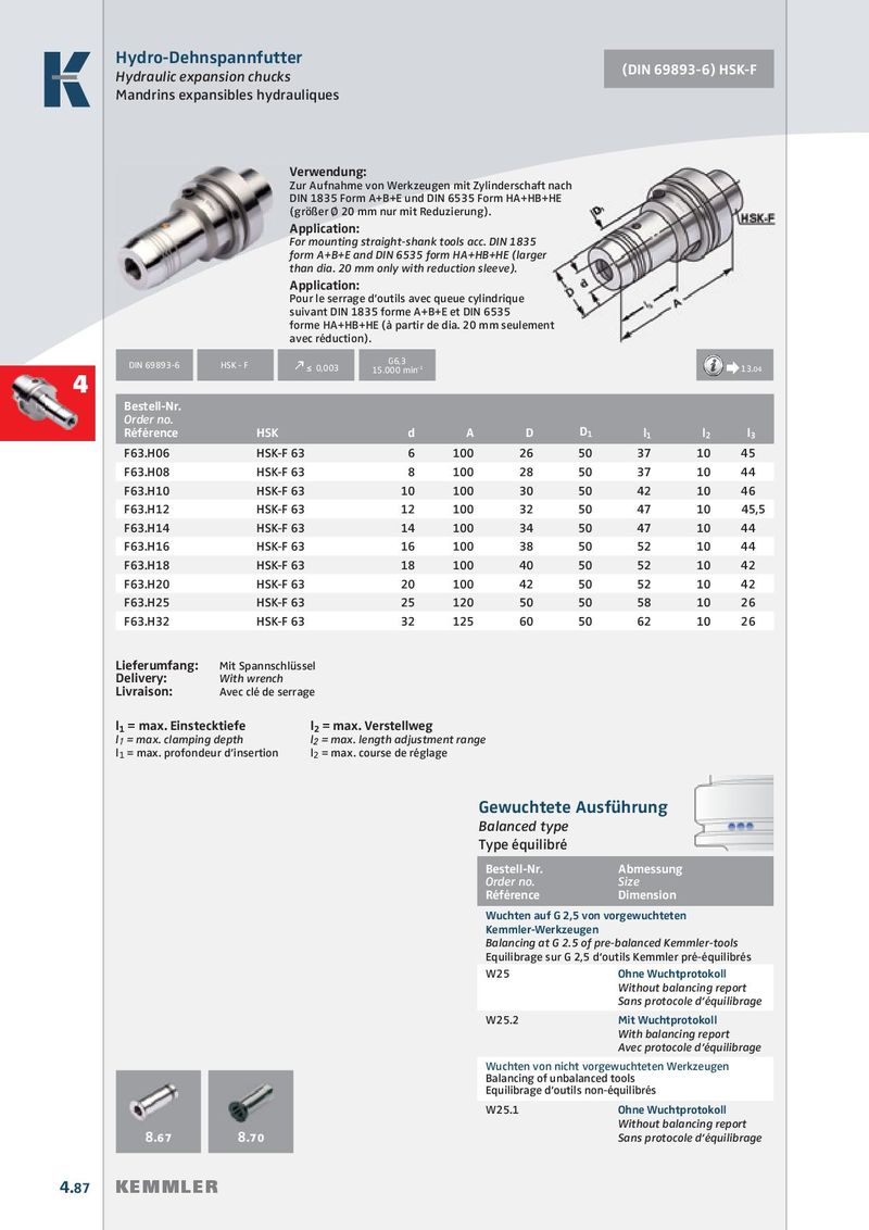 Hydro-Dehnspannfutter (DIN 69893-6) HSK-F Hydraulic expansion chucks Mandrins expansibles hydrauliques Verwendung: Zur Aufnahme von Werkzeugen mit Zylinderschaft nach DIN 1835 Form A+B+E und DIN 6535 Form HA+HB+HE (größer Ø 20 mm nur mit Reduzierung). Application: For mounting straight-shank tools acc. DIN 1835 form A+B+E and DIN 6535 form HA+HB+HE (larger than dia. 20 mm only with reduction sleeve). Application: Pour le serrage d’outils avec queue cylindrique suivant DIN 1835 forme A+B+E et DIN 6535 forme HA+HB+HE (à partir de dia. 20 mm seulement avec réduction). G6,3 DIN 69893-6 HSK - F k ≤ 0,003 15.000 min -1 Æ 13.04 4 Bestell-Nr. Order no. Référence HSK d A D D 1 l 1 l 2 l 3 F63.H06 HSK-F 63 6 100 26 50 37 10 45 F63.H08 HSK-F 63 8 100 28 50 37 10 44 F63.H10 HSK-F 63 10 100 30 50 42 10 46 F63.H12 HSK-F 63 12 100 32 50 47 10 45,5 F63.H14 HSK-F 63 14 100 34 50 47 10 44 F63.H16 HSK-F 63 16 100 38 50 52 10 44 F63.H18 HSK-F 63 18 100 40 50 52 10 42 F63.H20 HSK-F 63 20 100 42 50 52 10 42 F63.H25 HSK-F 63 25 120 50 50 58 10 26 F63.H32 HSK-F 63 32 125 60 50 62 10 26 Lieferumfang: Mit Spannschlüssel Delivery: With wrench Livraison: Avec clé de serrage l 1 = max. Einstecktiefe l 2 = max. Verstellweg l 1 = max. clamping depth l 2 = max. length adjustment range l 1 = max. profondeur d’insertion l 2 = max. course de réglage Gewuchtete Ausführung Balanced type Type équilibré Bestell-Nr. Abmessung Order no. Size Référence Dimension Wuchten auf G 2,5 von vorgewuchteten Kemmler-Werkzeugen Balancing at G 2.5 of pre-balanced Kemmler-tools Equilibrage sur G 2,5 d‘outils Kemmler pré-équilibrés W25 Ohne Wuchtprotokoll Without balancing report Sans protocole d‘équilibrage W25.2 Mit Wuchtprotokoll With balancing report Avec protocole d‘équilibrage Wuchten von nicht vorgewuchteten Werkzeugen Balancing of unbalanced tools Equilibrage d‘outils non-équilibrés W25.1 Ohne Wuchtprotokoll Without balancing report 8.67 8.70 Sans protocole d‘équilibrage 4.87 KEMMLER