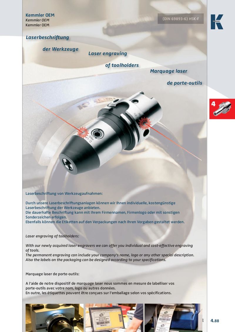 Kemmler OEM (DIN 69893-6) HSK-F (D (D (D ( IN 698 98 9893 93 93-6 - ) HS HS HSK- K-F Kemmler OEM Kemmler OEM Laserbeschriftung der Werkzeuge Laser engraving of toolholders Marquage laser de porte-outils 4 Laserbeschriftung von Werkzeugaufnahmen: Durch unsere Laserbeschriftungsanlagen können wir Ihnen individuelle, kostengünstige Laserbeschriftung der Werkzeuge anbieten. Die dauerhafte Beschriftung kann mit Ihrem Firmennamen, Firmenlogo oder mit sonstigen Sonderzeichen erfolgen. Ebenfalls können die Etiketten auf den Verpackungen nach Ihren Vorgaben gestaltet werden. Laser engraving of toolholders: With our newly acquired laser engravers we can offer you individual and cost-effective engraving of tools. The permanent engraving can include your company’s name, logo or any other special description. Also the labels on the packaging can be designed according to your specifications. Marquage laser de porte-outils: A l’aide de notre dispositif de marquage laser nous sommes en mesure de labelliser vos porte-outils avec votre nom, logo ou autres données. En outre, les étiquettes peuvent être conçues sur l‘emballage selon vos spécifications. KEMMLER KEMMLER 4.88