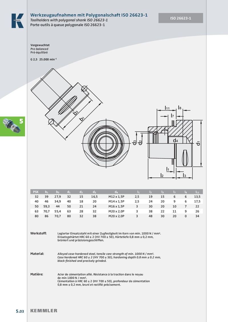 Werkzeugaufnahmen mit Polygonalschaft ISO 26623-1 ISO 26623-1 Toolholders with polygonal shank ISO 26623-1 Porte-outils à queue polygonale ISO 26623-1 Vorgewuchtet Pre-balanced Pré-équilibré G 2,5 25.000 min –1 ŭIJIJ ŭĹ ţĴ ŭĸ ţIJ 5 ťĵ ťĴ ťij ťIJ ŭIJ ŭij ŭĴ PSK b 1 b 3 d 1 d 2 d 3 d 4 l 1 l 2 l 3 l 7 l 8 l 11 32 39 27,9 32 15 16,5 M12 x 1,5P 2,5 19 15 6 6 13,5 40 46 34,9 40 18 20 M14 x 1,5P 2,5 24 20 9 6 17,5 50 59,3 44 50 21 24 M16 x 1,5P 3 30 20 10 7 22 63 70,7 55,4 63 28 32 M20 x 2,0P 3 38 22 11 9 26 80 86 70,7 80 32 38 M20 x 2,0P 3 48 30 20 0 34 Werkstoff: Legierter Einsatzstahl mit einer Zugfestigkeit im Kern von min. 1000 N / mm². Einsatzgehärtet HRC 60 ± 2 (HV 700 ± 50), Härtetiefe 0,8 mm ± 0,2 mm, brüniert und präzisionsgeschliffen. Material: Alloyed case-hardened steel, tensile core strength of min. 1000 N / mm². Case hardened HRC 60 ± 2 (HV 700 ± 50), hardening depth 0.8 mm ± 0.2 mm, black-fi nished and precisely grinded. Matière: Acier de cémentation allié. Résistance à la traction dans le noyau de min 1000 N / mm². Cémentation à HRC 60 ± 2 (HV 700 ± 50), profondeur de cémentation 0,8 mm ± 0,2 mm, bruni et rectifié précisement. 5.03 KEMMLER