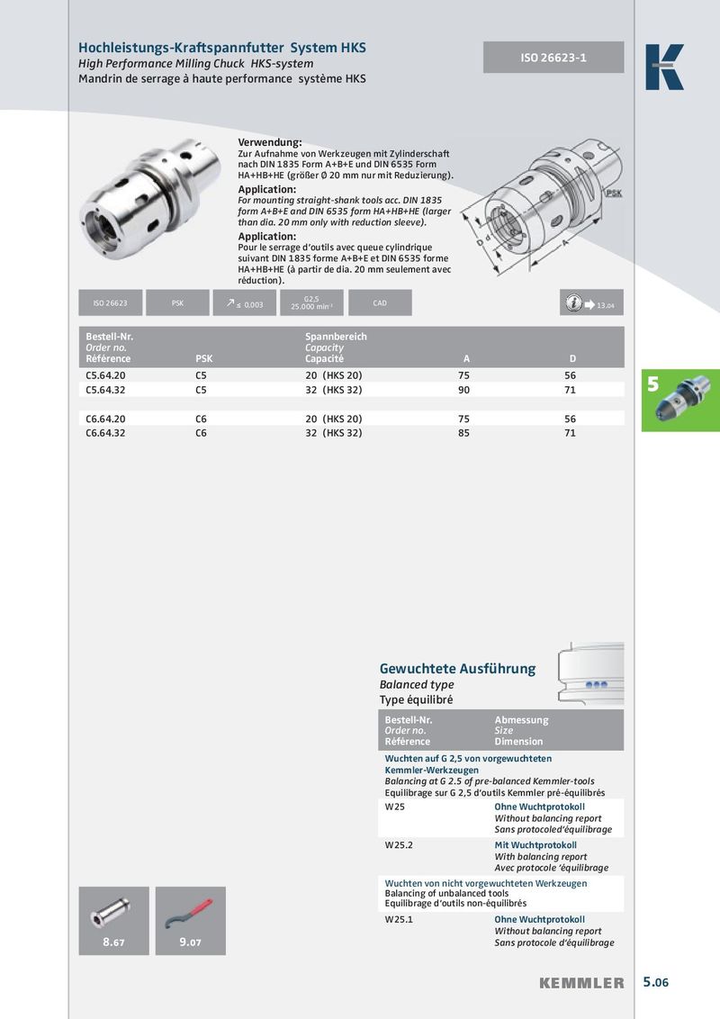 Hochleistungs-Kraftspannfutter System HKS ISO 26623-1 High Performance Milling Chuck HKS-system Mandrin de serrage à haute performance système HKS Verwendung: Zur Aufnahme von Werkzeugen mit Zylinderschaft nach DIN 1835 Form A+B+E und DIN 6535 Form HA+HB+HE (größer Ø 20 mm nur mit Reduzierung). Application: For mounting straight-shank tools acc. DIN 1835 form A+B+E and DIN 6535 form HA+HB+HE (larger than dia. 20 mm only with reduction sleeve). Application: Pour le serrage d’outils avec queue cylindrique suivant DIN 1835 forme A+B+E et DIN 6535 forme HA+HB+HE (à partir de dia. 20 mm seulement avec réduction). G2,5 ISO 26623 PSK k ≤ 0,003 25.000 min -1 CAD Æ 13.04 Bestell-Nr. Spannbereich Order no. Capacity Référence PSK Capacité A D C5.64.20 C5 20 (HKS 20) 75 56 C5.64.32 C5 32 (HKS 32) 90 71 5 C6.64.20 C6 20 (HKS 20) 75 56 C6.64.32 C6 32 (HKS 32) 85 71 Gewuchtete Ausführung Balanced type Type équilibré Bestell-Nr. Abmessung Order no. Size Référence Dimension Wuchten auf G 2,5 von vorgewuchteten Kemmler-Werkzeugen Balancing at G 2.5 of pre-balanced Kemmler-tools Equilibrage sur G 2,5 d‘outils Kemmler pré-équilibrés W25 Ohne Wuchtprotokoll Without balancing report Sans protocoled‘équilibrage W25.2 Mit Wuchtprotokoll With balancing report Avec protocole ‘équilibrage Wuchten von nicht vorgewuchteten Werkzeugen Balancing of unbalanced tools Equilibrage d‘outils non-équilibrés W25.1 Ohne Wuchtprotokoll Without balancing report 8.67 9.07 Sans protocole d‘équilibrage KEMMLER 5.06
