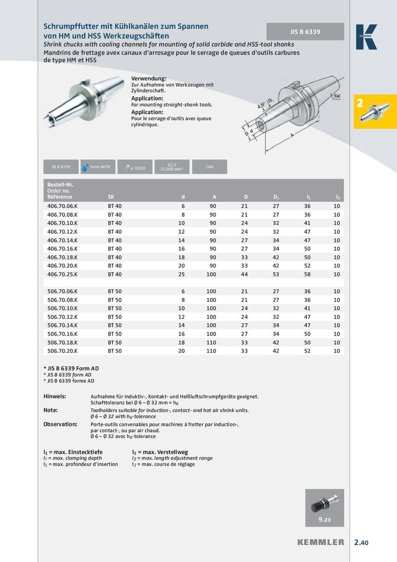 Schrumpffutter mit Kühlkanälen zum Spannen JIS B 6339 DIN 69871 von HM und HSS Werkzeugschäften Shrink chucks with cooling channels for mounting of solid carbide and HSS-tool shanks Mandrins de frettage avex canaux d‘arrosage pour le serrage de queues d‘outils carbures de type HM et HSS Verwendung: Zur Aufnahme von Werkzeugen mit Zylinderschaft. Application: For mounting straight-shank tools. 2 Application: Pour le serrage d’outils avec queue cylindrique. G2,5 JIS B 6339 Form AD/B Form AD/B k ≤ 0,003 25.000 min -1 CAD Bestell-Nr. Order no. Référence SK d A D D 1 l 1 l 2 406.70.06.K BT 40 6 90 21 27 36 10 406.70.08.K BT 40 8 90 21 27 36 10 406.70.10.K BT 40 10 90 24 32 41 10 406.70.12.K BT 40 12 90 24 32 47 10 406.70.14.K BT 40 14 90 27 34 47 10 406.70.16.K BT 40 16 90 27 34 50 10 406.70.18.K BT 40 18 90 33 42 50 10 406.70.20.K BT 40 20 90 33 42 52 10 406.70.25.K BT 40 25 100 44 53 58 10 506.70.06.K BT 50 6 100 21 27 36 10 506.70.08.K BT 50 8 100 21 27 36 10 506.70.10.K BT 50 10 100 24 32 41 10 506.70.12.K BT 50 12 100 24 32 47 10 506.70.14.K BT 50 14 100 27 34 47 10 506.70.16.K BT 50 16 100 27 34 50 10 506.70.18.K BT 50 18 110 33 42 50 10 506.70.20.K BT 50 20 110 33 42 52 10 * JIS B 6339 Form AD * JIS B 6339 form AD * JIS B 6339 forme AD Hinweis: Aufnahme für Induktiv-, Kontakt- und Heißluftschrumpfgeräte geeignet. Schafttoleranz bei Ø 6 – Ø 32 mm = h 6 Note: Toolholders suitable for induction-, contact- and hot air shrink units. Ø 6 – Ø 32 with h 6 -tolerance Observation: Porte-outils convenables pour machines à fretter par induction-, par contact-, ou par air chaud. Ø 6 – Ø 32 avec h 6 -tolerance l 1 = max. Einstecktiefe l 2 = max. Verstellweg l 1 = max. clamping depth l 2 = max. length adjustment range l 1 = max. profondeur d’insertion l 2 = max. course de réglage 9.23 KEMMLER 2.40