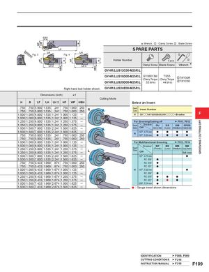 WF CWHF HBH H HF B HBH H GROOVING / CUTTING OFF CDX * Wrench : z : Clamp Screw, x : Blade Screw LFDAXN/DAXX Fig. 3LHLHFig. 4 SPARE PARTS z Holder Number 5 pcs. x LH 2 LH 2 Clamp Screw Blade Screw Wrench * GYHR/LUS12C00-M25R/L GYHR/LUS16D00-M25R/L GY06013M TS55(Clamp Torque(Clamp TorqueGYHR/LUS20D00-M25R/L: 53 lbf-in): 44 lbf-in)zTKY30RxTKY25D Right hand tool holder shown. GYHR/LUS24E00-M25R/L Dimensions (inch) *1 Cutting Mode H B LF LH LH 2 HF WF HBH Select an Insert .750.750.750 5.000 1.535.750 5.000 1.535.241.241.750 1.000.250.750 1.000.250R1.000 1.000 6.000 1.535 1.241 1.000 1.125─SeatSizeInsert NumberHGYoo0475/0500/0524Hoooo−Breaker F 1.000 1.000 6.000 1.535 1.241 1.000 1.125 ─ 1.250 1.250 6.000 1.535 1.241 1.250 1.375 ─ For Grooving/Cutting off F011, F012 1.250 1.250 6.000 1.535 1.241 1.250 1.375 ─ Seat Breaker GU GS GM GFGS 1.500 1.500 7.000 1.535 2.241 1.500 1.625 ─ Size CW (Gummy Steel) (Low) (Medium) (Hardened steel) 1.500 1.500 7.000 1.535 2.241 1.500 1.625 ─.750.750 5.000 1.535.241.750 1.000.250 H .187", 4.75 mm.197", 5.00 mmaa aa aa aa .750 .750 5.000 1.535 .241 .750 1.000 .250 1.000 1.000 6.000 1.535 1.241 1.000 1.125 ─ For Multifunctional Grooving F013, F014 1.000 1.000 6.000 1.535 1.241 1.000 1.125 ─1.250 1.250 6.000 1.535 1.241 1.250 1.375─1.250 1.250 6.000 1.535 1.241 1.250 1.375─LSeatSizeBreakerCWMF(Finish)MSMMBM(Low)(Medium) (Copying, Recessing)Ball nose 1.500 1.500 7.000 1.535 2.241 1.500 1.625 ─ .187", 4.75 mm a 1.500 1.500 7.000 1.535 2.241 1.500 1.625 ─ RE .008" a .750 .750 5.433 1.969 .674 .750 1.000 .250 RE .016" a .750 .750 5.433 1.969 .674 .750 1.000 .250 RE .031" a 1.000 1.000 6.433 1.969 1.674 1.000 1.125 ─ H .197", 5.00 mm a 1.000 1.000 6.433 1.969 1.674 1.000 1.125 ─ RE .008" a 1.250 1.250 6.433 1.969 1.674 1.250 1.375 ─ RE .016" a a a 1.250 1.250 6.433 1.969 1.674 1.250 1.375 ─ RE .031" a a a 1.500 1.500 7.433 1.969 2.674 1.500 1.625 ─ .206", 5.24 mm a 1.500 1.500 7.433 1.969 2.674 1.500 1.625 ─ a : Gauge insert shown dimensions IDENTIFICATION F008, F009 CUTTING CONDITIONS F216 INSTRUCTION MANUAL F218 F109