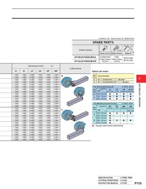 GROOVING / CUTTING OFF * Wrench : z : Clamp Screw, x : Blade Screw SPARE PARTS z Holder Number 5 pcs. x Clamp Screw Blade Screw Wrench * GYHRUS16D90-M25LGYHLUS16D90-M25R GY06013M TS55(Clamp Torque(Clamp Torque: 53 lbf-in): 44 lbf-in)zTKY30RxTKY25D Dimensions (inch) *1 Cutting Mode H B LF LH HF WF Select an Insert 1.0001.0001.0001.0006.0006.0001.5001.5001.0001.0002.0942.094R1.0001.0006.0001.5001.0002.094 SeatSizeInsert NumberDGYoo0200/0224Doooo−Breaker F 1.000 1.000 6.000 1.500 1.000 2.094 E GYoo0239/0250/0274Eoooo−Breaker 1.000 1.000 6.000 1.500 1.000 2.094 1.000 1.000 6.000 1.500 1.000 2.094 For Grooving/Cutting off F011, F012 1.000 1.000 6.000 1.500 1.000 2.0941.0001.0006.0001.5001.0002.094 SeatSize BreakerCW GU(Gummy Steel) GS(Low) GM GFGS(Medium) (Hardened steel) 1.000 1.000 6.000 1.500 1.000 2.094 D .079", 2.00 mm a a a a 1.000 1.000 6.000 1.500 1.000 2.0941.0001.0006.0001.5001.0002.094 E .094", 2.39 mm.098", 2.50 mm aa aa aa aa 1.000 1.000 6.000 1.500 1.000 2.094 1.000 1.000 6.000 1.500 1.000 2.094 For Multifunctional Grooving F013, F014 1.000 1.000 6.000 1.500 1.000 2.0941.0001.0001.0001.0006.0006.0001.5001.5001.0001.0002.0942.094LSeatSizeBreakerCWMF(Finish) MS MM BM(Low)(Medium) (Copying, Recessing)Ball nose 1.000 1.000 6.000 1.500 1.000 2.0941.0001.0006.0001.5001.0002.094 D .079", 2.00 mm.088", 2.24 mm aa a a a 1.000 1.000 6.000 1.500 1.000 2.094 .094", 2.39 mm a 1.000 1.000 6.000 1.500 1.000 2.094 E .098", 2.50 mm a a a a 1.000 1.000 6.000 1.500 1.000 2.094 .108", 2.74 mm a 1.000 1.000 6.000 1.500 1.000 2.094 a : Gauge insert shown dimensions 1.000 1.000 6.000 1.500 1.000 2.094 1.000 1.000 6.000 1.500 1.000 2.094 1.000 1.000 6.000 1.500 1.000 2.094 1.000 1.000 6.000 1.500 1.000 2.094 1.000 1.000 6.000 1.500 1.000 2.094 1.000 1.000 6.000 1.500 1.000 2.094 IDENTIFICATION F008, F009 CUTTING CONDITIONS F216 INSTRUCTION MANUAL F218 F119