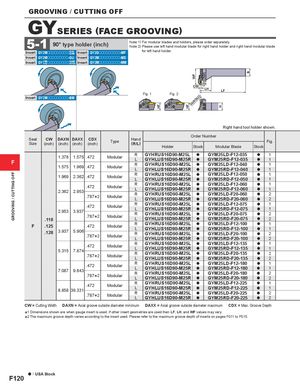 GROOVING / CUTTING OFF HF HF WF CDX H B GROOVING / CUTTING OFF GYSERIES (FACE GROOVING) 5-1 90° type holder (inch) Note 1) For modular blades and holders, please order separately.Note 2) Please use left hand modular blade for right hand holder and right hand modular blade Insert GY2Mooooooooo--G GSM Insert GY2Gooooooooo-MF for left hand holder. Insert GY2Mooooooooo-GU Insert GY2Mooooooooo-MS Insert GY11M G ooooooooo--G GFMGS Insert GY2Mooooooooo-MM CW LH LF Insert GY2Mooooooooo-BM Fig. 1 Fig. 2 DAXN/DAXX Right hand tool holder shown. Order Number Seat CW DAXN DAXX CDXSize(inch)(inch)(inch)(inch)TypeHand(R/L) Fig.HolderStockModular BladeStock F 1.378 1.575 .472 Modular R GYHRUS16D90-M25L a GYM25LD-F12-035 a 1LGYHLUS16D90-M25RaGYM25RD-F12-035a11.5751.969.472ModularRGYHRUS16D90-M25LaGYM25LD-F12-040a1LGYHLUS16D90-M25RaGYM25RD-F12-040a1 1.969 2.362 .472 Modular R GYHRUS16D90-M25L a GYM25LD-F12-050 a 1LGYHLUS16D90-M25RaGYM25RD-F12-050a1 .472 Modular2.3622.953* .7872ModularRGYHRUS16D90-M25L a GYM25LD-F12-060 a 1LGYHLUS16D90-M25RaGYM25RD-F12-060a1RGYHRUS16D90-M25LaGYM25LD-F20-060a2LGYHLUS16D90-M25RaGYM25RD-F20-060a2 .472 Modular2.9533.937.118* .7872ModularRGYHRUS16D90-M25L a GYM25LD-F12-075 a 1LGYHLUS16D90-M25RaGYM25RD-F12-075a1RGYHRUS16D90-M25LaGYM25LD-F20-075a2LGYHLUS16D90-M25RaGYM25RD-F20-075a2 F .125 .472 Modular.1283.9375.906* .7872ModularRGYHRUS16D90-M25L a GYM25LD-F12-100 a 1LGYHLUS16D90-M25RaGYM25RD-F12-100a1RGYHRUS16D90-M25LaGYM25LD-F20-100a2LGYHLUS16D90-M25RaGYM25RD-F20-100a2 .472 Modular5.3157.874* .7872ModularRGYHRUS16D90-M25L a GYM25LD-F12-135 a 1LGYHLUS16D90-M25RaGYM25RD-F12-135a1RGYHRUS16D90-M25LaGYM25LD-F20-135a2LGYHLUS16D90-M25RaGYM25RD-F20-135a2 .472 Modular7.0879.843* .7872ModularRGYHRUS16D90-M25L a GYM25LD-F12-180 a 1LGYHLUS16D90-M25RaGYM25RD-F12-180a1RGYHRUS16D90-M25LaGYM25LD-F20-180a2LGYHLUS16D90-M25RaGYM25RD-F20-180a2 .472 Modular8.85839.331* .7872ModularRGYHRUS16D90-M25L a GYM25LD-F12-225 a 1LGYHLUS16D90-M25RaGYM25RD-F12-225a1RGYHRUS16D90-M25LaGYM25LD-F20-225a2LGYHLUS16D90-M25RaGYM25RD-F20-225a2 CW = Cutting Width DAXN = Axial groove outside diameter minimum DAXX = Axial groove outside diameter maximum CDX = Max. Groove Depth **12 Dimensions shown are when gauge insert is used. If other The maximum groove depth varies according to the insert insert used. geometries are used then LF, LH, and WF Please refer to the maximum groove depth values may vary. of inserts on pages F011 to F015. a : USA Stock F120