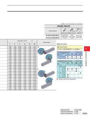 GROOVING / CUTTING OFF * Wrench : z : Clamp Screw, x : Blade Screw SPARE PARTS z Holder Number 5 pcs. x Clamp Screw Blade Screw Wrench * GYHRUS16D90-M25LGYHLUS16D90-M25R GY06013M TS55(Clamp Torque(Clamp Torque: 53 lbf-in): 44 lbf-in)zTKY30RxTKY25D Dimensions (inch) *1 Cutting Mode H B LF LH HF WF Select an Insert 1.0001.0001.0001.0006.0006.0001.5001.5001.0001.0002.0942.094R1.0001.0006.0001.5001.0002.094 SeatSizeInsert NumberFGYoo0300/0318/0324Foooo−Breaker F 1.000 1.000 6.000 1.500 1.000 2.094 1.000 1.000 6.000 1.500 1.000 2.094 For Grooving/Cutting off F011, F012 1.000 1.000 6.000 1.500 1.000 2.094 Seat Breaker GU GS GM GFGS 1.000 1.000 6.000 1.500 1.000 2.094 Size CW (Gummy Steel) (Low) (Medium) (Hardened steel) 1.000 1.000 6.000 1.500 1.000 2.0941.0001.0006.0001.5001.0002.330 F .118", 3.00 mm.125", 3.18 mm aa aa aa aa 1.000 1.000 6.000 1.500 1.000 2.330 1.000 1.000 6.000 1.500 1.000 2.094 For Multifunctional Grooving F013, F014 1.000 1.000 6.000 1.500 1.000 2.0941.0001.0006.0001.5001.0002.3301.0001.0006.0001.5001.0002.330SeatSizeBreakerCWMF(Finish) MS MM BM(Low)(Medium) (Copying, Recessing)Ball nose 1.000 1.000 6.000 1.500 1.000 2.094 .118", 3.00 mm a 1.0001.0001.0001.0006.0006.0001.5001.5001.0001.0002.0942.330L RE .008" a a aRE .016"aaa 1.000 1.000 6.000 1.500 1.000 2.3301.0001.0006.0001.5001.0002.094 F RE .031".125", 3.18 mm a a 1.000 1.000 6.000 1.500 1.000 2.094 RE .008" a 1.000 1.000 6.000 1.500 1.000 2.330 RE .016" a 1.000 1.000 6.000 1.500 1.000 2.330 .128", 3.24 mm a 1.000 1.000 6.000 1.500 1.000 2.094 a : Gauge insert shown dimensions 1.000 1.000 6.000 1.500 1.000 2.094 1.000 1.000 6.000 1.500 1.000 2.330 1.000 1.000 6.000 1.500 1.000 2.330 1.000 1.000 6.000 1.500 1.000 2.094 1.000 1.000 6.000 1.500 1.000 2.094 1.000 1.000 6.000 1.500 1.000 2.330 1.000 1.000 6.000 1.500 1.000 2.330 IDENTIFICATION F008, F009 CUTTING CONDITIONS F216 INSTRUCTION MANUAL F218 F121