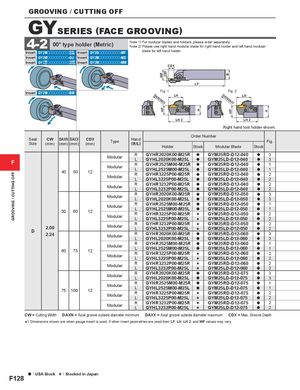GROOVING / CUTTING OFF WFHF CW H B HF H GROOVING / CUTTING OFF GYSERIES (FACE GROOVING) 4-2 00° type holder (Metric) Note 1) For modular blades and holders, please order separately.Note 2) Please use right hand modular blade for right hand holder and left hand modular Insert GY2Mooooooooo--G GSM Insert GY2Gooooooooo-MF blade for left hand holder. Insert GY2Mooooooooo-GU Insert GY2Mooooooooo-MS Insert GY11M G ooooooooo--G GFMGS Insert GY2Mooooooooo-MM CDX LF Insert GY2Mooooooooo-BM Fig. 1 Fig. 2DAXN/DAXXLHDAXN/DAXXLH LH 2 LH 2 Right hand tool holder shown. Order Number Seat CW DAXN DAXX CDXSize(mm)(mm) (mm)(mm)TypeHand(R/L) Fig.HolderStockModular BladeStock F Modular R GYHR2020K00-M25R a GYM25RD-D12-040 a 3LGYHL2020K00-M25LaGYM25LD-D12-040a3405012ModularRGYHR2525M00-M25RaGYM25RD-D12-040a1LGYHL2525M00-M25LaGYM25LD-D12-040a1ModularRGYHR3225P00-M25RaGYM25RD-D12-040a2LGYHL3225P00-M25LaGYM25LD-D12-040a2 Modular R GYHR3232P00-M25R a GYM25RD-D12-040 a 2LGYHL3232P00-M25LaGYM25LD-D12-040a2 Modular R GYHR2020K00-M25R a GYM25RD-D12-050 a 3LGYHL2020K00-M25LaGYM25LD-D12-050a3 50 60 12 Modular R GYHR2525M00-M25R a GYM25RD-D12-050 a 1LGYHL2525M00-M25LaGYM25LD-D12-050a1ModularRGYHR3225P00-M25RsGYM25RD-D12-050a2LGYHL3225P00-M25LsGYM25LD-D12-050a2 D 2.002.24 Modular R GYHR3232P00-M25R s GYM25RD-D12-050 a 2LGYHL3232P00-M25LsGYM25LD-D12-050a2ModularRGYHR2020K00-M25RaGYM25RD-D12-060a3LGYHL2020K00-M25LaGYM25LD-D12-060a3 60 75 12 Modular R GYHR2525M00-M25R a GYM25RD-D12-060 a 1LGYHL2525M00-M25LaGYM25LD-D12-060a1ModularRGYHR3225P00-M25RsGYM25RD-D12-060a2LGYHL3225P00-M25LsGYM25LD-D12-060a2 Modular R GYHR3232P00-M25R s GYM25RD-D12-060 a 2LGYHL3232P00-M25LsGYM25LD-D12-060a2 Modular R GYHR2020K00-M25R a GYM25RD-D12-075 a 3LGYHL2020K00-M25LaGYM25LD-D12-075a3 75 100 12 Modular R GYHR2525M00-M25R a GYM25RD-D12-075 a 1LGYHL2525M00-M25LaGYM25LD-D12-075a1ModularRGYHR3225P00-M25RsGYM25RD-D12-075a2LGYHL3225P00-M25LsGYM25LD-D12-075a2 Modular R GYHR3232P00-M25R s GYM25RD-D12-075 a 2LGYHL3232P00-M25LsGYM25LD-D12-075a2 CW = Cutting Width DAXN = Axial groove outside diameter minimum DAXX = Axial groove outside diameter maximum CDX = Max. Groove Depth *1 Dimensions shown are when gauge insert is used. If other insert geometries are used then LF, LH, LH 2, and WF values may vary. a : USA Stock s : Stocked in Japan F128