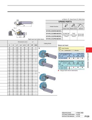 WF CWHF HBH H B GROOVING / CUTTING OFF CDX * Wrench : z : Clamp Screw, x : Blade Screw SPARE PARTS z LF Holder Number 5 pcs. x Fig. 3DAXN/DAXXLH Clamp Screw Blade Screw Wrench *GYHR/L2020K00-M25R/L LH 2 GYHR/L2525M00-M25R/LGYHR/L3225P00-M25R/LGY06013M TS55(Clamp Torque(Clamp Torque: 53 lbf-in): 44 lbf-in)zTKY30RxTKY25D Right hand tool holder shown. GYHR/L3232P00-M25R/L Dimensions (mm) *1 Cutting Mode H B LF LH LH 2 HF WF HBH Select an Insert 20 20 125 39 60 20 2620201253960202655R252515039572528─ SeatSizeInsert NumberDGYoo0200/0224Doooo−Breaker F 25 25 150 39 57 25 28 ─ 32 25 170 39 57 32 28 ─ For Grooving/Cutting off F011, F012 32 25 170 39 57 32 28 ─ Seat Breaker GU GS GM GFGS 32 32 170 39 57 32 35 ─ Size CW (Gummy Steel) (Low) (Medium) (Hardened steel) 32 32 170 39 57 32 35 ─ D .079", 2.00 mm a a a a 20 20 125 39 60 20 26 5 20 20 125 39 60 20 26 5 For Multifunctional Grooving F013, F014 25 25 150 39 57 25 28 ─252515039572528─322517039573228─ SeatSize BreakerCW MF(Finish) MS MM BM(Low)(Medium) (Copying, Recessing)Ball nose 32 25 170 39 57 32 28 ─323217039573235─ D .079", 2.00 mm.088", 2.24 mm aa a a a 32 32 170 39 57 32 35 ─ a : Gauge insert shown dimensions 20 20 125 39 60 20 2620201253960202655L 25 25 150 39 57 25 28 ─ 25 25 150 39 57 25 28 ─ 32 25 170 39 57 32 28 ─ 32 25 170 39 57 32 28 ─ 32 32 170 39 57 32 35 ─ 32 32 170 39 57 32 35 ─ 20 20 125 39 60 20 26 5 20 20 125 39 60 20 26 5 25 25 150 39 57 25 28 ─ 25 25 150 39 57 25 28 ─ 32 25 170 39 57 32 28 ─ 32 25 170 39 57 32 28 ─ 32 32 170 39 57 32 35 ─ 32 32 170 39 57 32 35 ─ IDENTIFICATION F008, F009 CUTTING CONDITIONS F216 INSTRUCTION MANUAL F218 F129