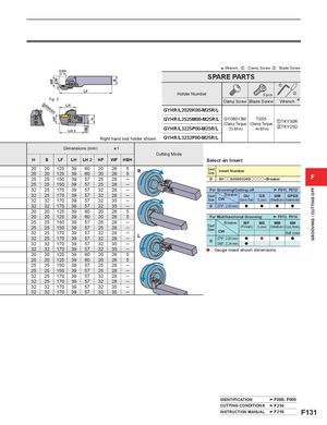 WF CWHF HBH H B GROOVING / CUTTING OFF CDX * Wrench : z : Clamp Screw, x : Blade Screw SPARE PARTS z LF Holder Number 5 pcs. x Fig. 3DAXN/DAXXLH Clamp Screw Blade Screw Wrench *GYHR/L2020K00-M25R/L LH 2 GYHR/L2525M00-M25R/LGYHR/L3225P00-M25R/LGY06013M TS55(Clamp Torque(Clamp Torque: 53 lbf-in): 44 lbf-in)zTKY30RxTKY25D Right hand tool holder shown. GYHR/L3232P00-M25R/L Dimensions (mm) *1 Cutting Mode H B LF LH LH 2 HF WF HBH Select an Insert 20 20 125 39 60 20 2620201253960202655R252515039572528─ SeatSizeInsert NumberDGYoo0200/0224Doooo−Breaker F 25 25 150 39 57 25 28 ─ 32 25 170 39 57 32 28 ─ For Grooving/Cutting off F011, F012 32 25 170 39 57 32 28 ─ Seat Breaker GU GS GM GFGS 32 32 170 39 57 32 35 ─ Size CW (Gummy Steel) (Low) (Medium) (Hardened steel) 32 32 170 39 57 32 35 ─ D .079", 2.00 mm a a a a 20 20 125 39 60 20 26 5 20 20 125 39 60 20 26 5 For Multifunctional Grooving F013, F014 25 25 150 39 57 25 28 ─252515039572528─323225170392517039575732322828──L323217039573235─SeatSizeBreakerCWMF(Finish)MS MM BM(Low)(Medium) (Copying, Recessing)Ball noseD.079", 2.00 mm.088", 2.24 mmaaaaa 32 32 170 39 57 32 35 ─ a : Gauge insert shown dimensions 20 20 125 39 60 20 26 5 20 20 125 39 60 20 26 5 25 25 150 39 57 25 28 ─ 25 25 150 39 57 25 28 ─ 32 25 170 39 57 32 28 ─ 32 25 170 39 57 32 28 ─ 32 32 170 39 57 32 35 ─ 32 32 170 39 57 32 35 ─ IDENTIFICATION F008, F009 CUTTING CONDITIONS F216 INSTRUCTION MANUAL F218 F131