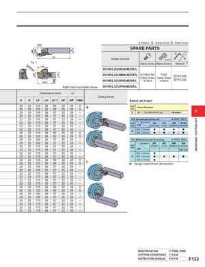 WF CWHF HBH H B GROOVING / CUTTING OFF CDX * Wrench : z : Clamp Screw, x : Blade Screw SPARE PARTS z LF Holder Number 5 pcs. x Fig. 3DAXN/DAXXLH Clamp Screw Blade Screw Wrench *GYHR/L2020K00-M25R/L LH 2 GYHR/L2525M00-M25R/LGYHR/L3225P00-M25R/LGY06013M TS55(Clamp Torque(Clamp Torque: 53 lbf-in): 44 lbf-in)zTKY30RxTKY25D Right hand tool holder shown. GYHR/L3232P00-M25R/L Dimensions (mm) *1 Cutting Mode H B LF LH LH 2 HF WF HBH Select an Insert 20 20 125 39 60 20 2620201253960202655R252515039572528─ SeatSizeInsert NumberEGYoo0239/0250/0274Eoooo−Breaker F 25 25 150 39 57 25 28 ─ 32 25 170 39 57 32 28 ─ For Grooving/Cutting off F011, F012 32 25 170 39 57 32 28 ─ Seat Breaker GU GS GM GFGS 32 32 170 39 57 32 35 ─ Size CW (Gummy Steel) (Low) (Medium) (Hardened steel) 32 32 170 39 57 32 35 ─2020125396020265 E .094", 2.39 mm.098", 2.50 mm aa aa aa aa 20 20 125 39 60 20 26 5 25 25 150 39 57 25 28 ─ For Multifunctional Grooving F013, F014 25 25 150 39 57 25 28 ─322517039573228─322517039573228─ SeatSize BreakerCW MF(Finish) MS MM BM(Low)(Medium) (Copying, Recessing)Ball nose 32 32 170 39 57 32 35 ─ .094", 2.39 mm a 32 32 170 39 57 32 35 ─ E .098", 2.50 mm a a a a 20 20 125 39 60 20 2620201253960202655L .108", 2.74 mm aa : Gauge insert shown dimensions 25 25 150 39 57 25 28 ─ 25 25 150 39 57 25 28 ─ 32 25 170 39 57 32 28 ─ 32 25 170 39 57 32 28 ─ 32 32 170 39 57 32 35 ─ 32 32 170 39 57 32 35 ─ 20 20 125 39 60 20 26 5 20 20 125 39 60 20 26 5 25 25 150 39 57 25 28 ─ 25 25 150 39 57 25 28 ─ 32 25 170 39 57 32 28 ─ 32 25 170 39 57 32 28 ─ 32 32 170 39 57 32 35 ─ 32 32 170 39 57 32 35 ─ IDENTIFICATION F008, F009 CUTTING CONDITIONS F216 INSTRUCTION MANUAL F218 F133