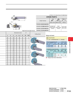 WF CWHF HBH H B GROOVING / CUTTING OFF CDX * Wrench : z : Clamp Screw, x : Blade Screw SPARE PARTS z LF Holder Number 5 pcs. x Fig. 3DAXN/DAXXLH Clamp Screw Blade Screw Wrench *GYHR/L2020K00-M25R/L LH 2 GYHR/L2525M00-M25R/LGYHR/L3225P00-M25R/LGY06013M TS55(Clamp Torque(Clamp Torque: 53 lbf-in): 44 lbf-in)zTKY30RxTKY25D Right hand tool holder shown. GYHR/L3232P00-M25R/L Dimensions (mm) *1 Cutting Mode H B LF LH LH 2 HF WF HBH Select an Insert 20 20 125 39 60 20 2620201253960202655R252515039572528─ SeatSizeInsert NumberEGYoo0239/0250/0274Eoooo−Breaker F 25 25 150 39 57 25 28 ─ 32 25 170 39 57 32 28 ─ For Grooving/Cutting off F011, F012 32 25 170 39 57 32 28 ─ Seat Breaker GU GS GM GFGS 32 32 170 39 57 32 35 ─ Size CW (Gummy Steel) (Low) (Medium) (Hardened steel) 32 32 170 39 57 32 35 ─2020125396020265 E .094", 2.39 mm.098", 2.50 mm aa aa aa aa 20 20 125 39 60 20 26 5 25 25 150 39 57 25 28 ─ For Multifunctional Grooving F013, F014 25 25 150 39 57 25 28 ─323225170392517039575732322828──L SeatSize BreakerCW MF(Finish) MS MM BM(Low)(Medium) (Copying, Recessing)Ball nose 32 32 170 39 57 32 35 ─ .094", 2.39 mm a 32 32 170 39 57 32 35 ─ E .098", 2.50 mm a a a a 20 20 125 39 60 20 26 5 .108", 2.74 mm a 20 20 125 39 60 20 26 5 a : Gauge insert shown dimensions 25 25 150 39 57 25 28 ─ 25 25 150 39 57 25 28 ─ 32 25 170 39 57 32 28 ─ 32 25 170 39 57 32 28 ─ 32 32 170 39 57 32 35 ─ 32 32 170 39 57 32 35 ─ IDENTIFICATION F008, F009 CUTTING CONDITIONS F216 INSTRUCTION MANUAL F218 F135