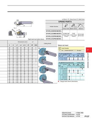 WF CWHF HBH H B GROOVING / CUTTING OFF CDX * Wrench : z : Clamp Screw, x : Blade Screw SPARE PARTS z LF Holder Number 5 pcs. x Fig. 3DAXN/DAXXLH Clamp Screw Blade Screw Wrench *GYHR/L2020K00-M25R/L LH 2 GYHR/L2525M00-M25R/LGYHR/L3225P00-M25R/LGY06013M TS55(Clamp Torque(Clamp Torque: 53 lbf-in): 44 lbf-in)zTKY30RxTKY25D Right hand tool holder shown. GYHR/L3232P00-M25R/L Dimensions (mm) *1 Cutting Mode H B LF LH LH 2 HF WF HBH Select an Insert 20 20 125 39 60 20 2620201253960202655R252515039572528─ SeatSizeInsert NumberFGYoo0300/0318/0324Foooo−Breaker F 25 25 150 39 57 25 28 ─ 32 25 170 39 57 32 28 ─ For Grooving/Cutting off F011, F012 32 25 170 39 57 32 28 ─ Seat Breaker GU GS GM GFGS 32 32 170 39 57 32 35 ─ Size CW (Gummy Steel) (Low) (Medium) (Hardened steel) 32 32 170 39 57 32 35 ─2020125396020265 F .118", 3.00 mm.125", 3.18 mm aa aa aa aa 20 20 125 39 60 20 26 5 25 25 150 39 57 25 28 ─ For Multifunctional Grooving F013, F014 25 25 150 39 57 25 28 ─323225170392517039575732322828──L SeatSize BreakerCW MF(Finish) MS MM BM(Low)(Medium) (Copying, Recessing)Ball nose 32 32 170 39 57 32 35 ─ .118", 3.00 mm a 32 32 170 39 57 32 35 ─ RE 0.2 mm a a a 20 20 125 39 60 20 26 5 RE 0.4 mm a a a 20 20 125 39 60 20 26 5252515039572528─ F RE 0.8 mm.125", 3.18 mm a a 25 25 150 39 57 25 28 ─ RE 0.2 mm a 32 25 170 39 57 32 28 ─ RE 0.4 mm a 32 25 170 39 57 32 28 ─ .128", 3.24 mm a 32 32 170 39 57 32 35 ─ a : Gauge insert shown dimensions 32 32 170 39 57 32 35 ─ IDENTIFICATION F008, F009 CUTTING CONDITIONS F216 INSTRUCTION MANUAL F218 F137