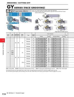 GROOVING / CUTTING OFF WFHFHF CW HH HFHF B HH GROOVING / CUTTING OFF GYSERIES (FACE GROOVING) 4-2 00° type holder (Metric) Note 1) For modular blades and holders, please order separately.Note 2) Please use right hand modular blade for right hand holder and left hand modular Insert GY2Mooooooooo--G GSM Insert GY2Gooooooooo-MFInsertGY2Mooooooooo-GUInsertGY2Mooooooooo-MSblade for left hand holder.CDX Insert GY11M G ooooooooo--G GFMGS Insert GY2Mooooooooo-MM LF DAXN/DAXX Fig. 1 LH LHFig. 2 Insert GY2Mooooooooo-BM LH 2 LH 2 DAXN/DAXX Fig. 5 LH Fig. 6 LH LH 2 LH 2 Right hand tool holder shown. Order Number Seat CW DAXN DAXX CDXSize(mm)(mm) (mm)(mm)TypeHand(R/L) Fig.HolderStockModular BladeStock F Modular R GYHR2020K00-M25R a GYM25RD-H14-050 a 3LGYHL2020K00-M25LaGYM25LD-H14-050a3506014ModularRGYHR2525M00-M25RaGYM25RD-H14-050a1LGYHL2525M00-M25LaGYM25LD-H14-050a1ModularRGYHR3225P00-M25RsGYM25RD-H14-050a5LGYHL3225P00-M25LsGYM25LD-H14-050a5 Modular R GYHR3232P00-M25R s GYM25RD-H14-050 a 5LGYHL3232P00-M25LsGYM25LD-H14-050a5 Modular R GYHR2020K00-M25R a GYM25RD-H14-060 a 3LGYHL2020K00-M25LaGYM25LD-H14-060a3 4.75H5.005.24 14 Modular R GYHR2525M00-M25R a GYM25RD-H14-060 a 1LGYHL2525M00-M25LaGYM25LD-H14-060a1ModularRGYHR3225P00-M25RsGYM25RD-H14-060a5LGYHL3225P00-M25LsGYM25LD-H14-060a5 60 85 Modular R GYHR3232P00-M25R s GYM25RD-H14-060 a 5LGYHL3232P00-M25LsGYM25LD-H14-060a5ModularRGYHR2020K00-M25RaGYM25RD-H25-060a4LGYHL2020K00-M25LaGYM25LD-H25-060a4 Modular25 *2ModularRGYHR2525M00-M25R a GYM25RD-H25-060 a 2LGYHL2525M00-M25LaGYM25LD-H25-060a2RGYHR3225P00-M25RsGYM25RD-H25-060a6LGYHL3225P00-M25LsGYM25LD-H25-060a6 Modular R GYHR3232P00-M25R s GYM25RD-H25-060 a 6LGYHL3232P00-M25LsGYM25LD-H25-060a6 CW = Cutting Width DAXN = Axial groove outside diameter minimum DAXX = Axial groove outside diameter maximum CDX = Max. Groove Depth **12 Dimensions shown are when gauge insert is used. If other The maximum groove depth varies according to the insert insert used. geometries are used then LF, LH, LH 2, and Please refer to the maximum groove depth of WF values may vary. inserts on pages F011 to F015. a : USA Stock s : Stocked in Japan F150