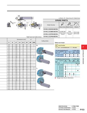 WF CWHF HBH H HF B HBH H GROOVING / CUTTING OFF CDX * Wrench : z : Clamp Screw, x : Blade Screw LFDAXN/DAXX Fig. 3LHLHFig. 4 SPARE PARTS z Holder Number 5 pcs. x LH 2 LH 2 Clamp Screw Blade Screw Wrench * GYHR/L2020K00-M25R/L GYHR/L2525M00-M25R/LGYHR/L3225P00-M25R/LGY06013M TS55(Clamp Torque(Clamp Torque: 53 lbf-in): 44 lbf-in)zTKY30RxTKY25D Right hand tool holder shown. GYHR/L3232P00-M25R/L Dimensions (mm) *1 Cutting Mode H B LF LH LH 2 HF WF HBH Select an Insert 20 20 125 39 60 20 2620201253960202655R252515039572528─ SeatSizeInsert NumberHGYoo0475/0500/0524Hoooo−Breaker F 25 25 150 39 57 25 28 ─ 32 25 170 39 57 32 28 ─ For Grooving/Cutting off F011, F012 32 25 170 39 57 32 28 ─ Seat Breaker GU GS GM GFGS 32 32 170 39 57 32 35 ─ Size CW (Gummy Steel) (Low) (Medium) (Hardened steel) 32 32 170 39 57 32 35 ─2020136507120265 H .187", 4.75 mm.197", 5.00 mmaa aa aa aa 20 20 136 50 71 20 26 5 25 25 161 50 68 25 28 ─ For Multifunctional Grooving F013, F014 25 25 161 50 68 25 28 ─322518150683228─322518150683228─ SeatSize BreakerCW MF(Finish) MS MM BM(Low)(Medium) (Copying, Recessing)Ball nose 32 32 181 50 68 32 35 ─ .187", 4.75 mm a 32 32 181 50 68 32 35 ─ RE 0.2 mm a 20 20 125 39 60 20 2620201253960202655L RE 0.4 mm aRE 0.8 mma 25 25 150 39 57 25 28 ─ H .197", 5.00 mm a 25 25 150 39 57 25 28 ─ RE 0.2 mm a 32 25 170 39 57 32 28 ─ RE 0.4 mm a a a 32 25 170 39 57 32 28 ─ RE 0.8 mm a a a 32 32 170 39 57 32 35 ─ .206", 5.24 mm a 32 32 170 39 57 32 35 ─ a : Gauge insert shown dimensions 20 20 136 50 71 20 26 5 20 20 136 50 71 20 26 5 25 25 161 50 68 25 28 ─ 25 25 161 50 68 25 28 ─ 32 25 181 50 68 32 28 ─ 32 25 181 50 68 32 28 ─ 32 32 181 50 68 32 35 ─ 32 32 181 50 68 32 35 ─ IDENTIFICATION F008, F009 CUTTING CONDITIONS F216 INSTRUCTION MANUAL F218 F153