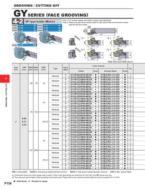 GROOVING / CUTTING OFF WFHFHF CW HH HFHF B HH GROOVING / CUTTING OFF GYSERIES (FACE GROOVING) 4-2 00° type holder (Metric) Note 1) For modular blades and holders, please order separately.Note 2) Please use right hand modular blade for right hand holder and left hand modular Insert GY2Mooooooooo--G GSM Insert GY2Gooooooooo-MFInsertGY2Mooooooooo-GUInsertGY2Mooooooooo-MSblade for left hand holder.CDX Insert GY1Gooooooooo- GF GS Insert GY2Mooooooooo-MM LF DAXN/DAXX Fig. 1 LH LHFig. 2 Insert GY2Mooooooooo-BM LH 2 LH 2 DAXN/DAXX Fig. 5 LH Fig. 6 LH LH 2 LH 2 Right hand tool holder shown. Order Number Seat CW DAXN DAXX CDXSize(mm)(mm) (mm)(mm)TypeHand(R/L) Fig.HolderStockModular BladeStock F Modular R GYHR2020K00-M25R a GYM25RD-J14-050 a 3LGYHL2020K00-M25LaGYM25LD-J14-050a3507014ModularRGYHR2525M00-M25RaGYM25RD-J14-050a1LGYHL2525M00-M25LaGYM25LD-J14-050a1ModularRGYHR3225P00-M25RsGYM25RD-J14-050a5LGYHL3225P00-M25LsGYM25LD-J14-050a5 Modular R GYHR3232P00-M25R s GYM25RD-J14-050 a 5LGYHL3232P00-M25LsGYM25LD-J14-050a5 Modular R GYHR2020K00-M25R a GYM25RD-J14-070 a 3LGYHL2020K00-M25LaGYM25LD-J14-070a3 14 Modular R GYHR2525M00-M25R a GYM25RD-J14-070 a 1LGYHL2525M00-M25LaGYM25LD-J14-070a1ModularRGYHR3225P00-M25RsGYM25RD-J14-070a5LGYHL3225P00-M25LsGYM25LD-J14-070a5 70 110 Modular R GYHR3232P00-M25R s GYM25RD-J14-070 a 5LGYHL3232P00-M25LsGYM25LD-J14-070a5ModularRGYHR2020K00-M25RaGYM25RD-J25-070a4LGYHL2020K00-M25LaGYM25LD-J25-070a4 6.00J6.316.35 Modular25 *2ModularR GYHR2525M00-M25R a GYM25RD-J25-070 a 2LGYHL2525M00-M25LaGYM25LD-J25-070a2RGYHR3225P00-M25RsGYM25RD-J25-070a6LGYHL3225P00-M25LsGYM25LD-J25-070a6 Modular R GYHR3232P00-M25R s GYM25RD-J25-070 a 6LGYHL3232P00-M25LsGYM25LD-J25-070a6 Modular R GYHR2020K00-M25R a GYM25RD-J14-110 a 3LGYHL2020K00-M25LaGYM25LD-J14-110a3 14 Modular R GYHR2525M00-M25R a GYM25RD-J14-110 a 1LGYHL2525M00-M25LaGYM25LD-J14-110a1ModularRGYHR3225P00-M25RsGYM25RD-J14-110a5LGYHL3225P00-M25LsGYM25LD-J14-110a5 110 200 Modular R GYHR3232P00-M25R s GYM25RD-J14-110 a 5LGYHL3232P00-M25LsGYM25LD-J14-110a5ModularRGYHR2020K00-M25RaGYM25RD-J25-110a4LGYHL2020K00-M25LaGYM25LD-J25-110a4 Modular25 *2ModularR GYHR2525M00-M25R a GYM25RD-J25-110 a 2LGYHL2525M00-M25LaGYM25LD-J25-110a2RGYHR3225P00-M25RsGYM25RD-J25-110a6LGYHL3225P00-M25LsGYM25LD-J25-110a6 Modular R GYHR3232P00-M25R s GYM25RD-J25-110 a 6LGYHL3232P00-M25LsGYM25LD-J25-110a6 CW = Cutting Width DAXN = Axial groove outside diameter minimum DAXX = Axial groove outside diameter maximum CDX = Max. Groove Depth **12 Dimensions shown are when gauge insert is used. If other The maximum groove depth varies according to the insert insert used. geometries are used then LF, LH, LH 2, and Please refer to the maximum groove depth of WF values may vary. inserts on pages F011 to F015. a : USA Stock s : Stocked in Japan F156