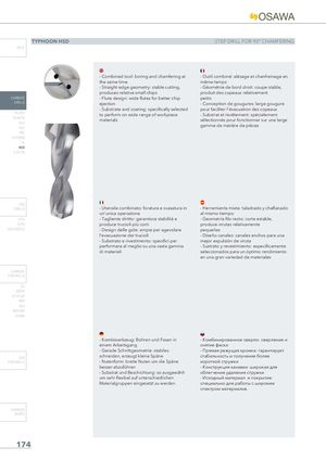 TYPHOON HSD STEP DRILL FOR 90° CHAMFERING INFO - Combined tool: boring and chamfering at - Outil combiné: alésage et chanfreinage en the same time même temps - Straight edge geometry: stable cutting, - Géométrie de bord droit: coupe stable, produces relative small chips produit des copeaux relativement CARBIDE - Flute design: wide flutes for better chip petits DRILLS ejection - Conception de gougures: large gougure - Substrate and coating: specifically selected pour faciliter l'évacuation des copeaux PU-HPU to perform on wide range of workpiece - Substrat et revêtement: spécialement TA-4HTA materials sélectionnés pour fonctionner sur une large SUHALH gamme de matière de pièces HRC SUH MINI HL HSD C-SD-TA HSS DRILLS - Utensile combinato: foratura e svasatura in - Herramienta mixta: taladrado y chaflanado un'unica operazione al mismo tiempo LFTA - Tagliente diritto: garantisce stabilità e - Geometría filo recto: corte estable, SUTA produce trucioli più corti produce virutas relativamente HSS-HSS/CO - Design delle gole: ampie per agevolare pequeñas l'evacuazione dei trucioli - Diseño canales: canales anchos para una - Substrato e rivestimento: specifici per mejor expulsión de viruta performare al meglio su una vasta gamma - Sustrato y revestimiento: específicamente di materiali seleccionados para un óptimo rendimiento en una gran variedad de materiales CARBIDE END-MILLS G2 MDTA HF VH/UP MEF ALU MEX/MH UH/MH - Kombiwerkzeug: Bohren und Fasen in - Комбинированное сверло: сверление и einem Arbeitsgang снятие фаски - Gerade Schnittgeometrie: stabiles - Прямая режущая кромка: гарантирует HSS schneiden, erzeugt kleine Späne стабильность и получение более END-MILLS - Nutenform: breite Nuten um die Späne короткой стружки besser abzuführen - Конструкция канавки: широкая для - Substrat und Beschichtung: so ausgewählt облегчения удаления стружки um sehr flexibel auf unterschiedlichen - Исходный материал и покрытие: Materialgruppen eingesetzt zu werden специально для работы с широким спектром материалов. CARBIDE BURRS 174