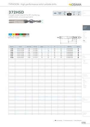 TYPHOON - high performance solid carbide drills 372HSDthrough coolant step drill for 90° chamfering, 3XD OSAWANORM HSD PV300 INFO weldon shank, universal application CARBIDE DRILLS PU-HPU TA-4HTA P M K N S H SUH ALH H H H HRC 1st choice suitable SUH MINI HL HSD C-SD-TA D(m7) D Tol. D1(h10) D1 Tol. d(h6) l l1 L EDP No. Stock 3.30 +0.016/+0.004 5.00 0/-0.048 6 11 28 66 372HSD0330 h 4.20 +0.016/+0.004 6.00 0/-0.048 6 14 28 66 372HSD0420 h 5.00 +0.016/+0.004 8.00 0/-0.058 8 17 41 79 372HSD0500 h 6.80 +0.021/+0.006 10.00 0/-0.058 10 21 47 89 372HSD0680 h 8.50 +0.021/+0.006 12.00 0/-0.070 12 26 55 102 372HSD0850 h HSS 10.30 +0.025/+0.007 14.00 0/-0.070 14 30 60 107 372HSD1030 h DRILLS LFTA SUTA HSS-HSS/CO CARBIDE END-MILLS G2 MDTA HF VH/UP MEF ALU MEX/MH UH/MH HSS END-MILLS CARBIDE BURRS h stock standard f non-standard stock m stock exhaustion 175