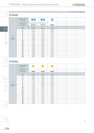 TYPHOON - high performance solid carbide drills CUTTING PARAMETERS INFO 372HSD Material Group P1 P2 P3 P4 P7 ISO 513 Hardness/Rm 500÷700 N/mm² 600÷1000 N/mm² Vc (m/min) 80÷120 70÷110 40÷80 D fn fn fn CARBIDE (mm) (mm/rev) (mm/rev) (mm/rev) DRILLS 3 0.130 0.130 0.075 4 0.150 0.150 0.090 PU-HPU 5 0.170 0.170 0.100 TA-4HTA 6 0.190 0.190 0.110 SUH 7 0.220 0.220 0.120 ALH HRC Ø RUN OUT<0.02mmSUH MINI89 0.250 0.250 0.1300.2800.2800.140 HL 10 0.300 0.300 0.150 HSD 11 0.310 0.310 0.155 C-SD-TA 12 0.330 0.330 0.160 13 0.340 0.340 0.165 14 0.360 0.360 0.175 15 0.380 0.380 0.180 16 0.400 0.400 0.185 17 0.410 0.410 0.195 18 0.420 0.420 0.200 19 0.420 0.420 0.200 20 0.420 0.420 0.210 HSS DRILLS 372HSD LFTA SUTAHSS-HSS/CO Material Group M1 M2 M3ISO 513 Hardness/Rm Vc (m/min) 40÷80 40÷80 30÷60 D fn fn fn (mm) (mm/rev) (mm/rev) (mm/rev) 3 0.075 0.055 0.055 CARBIDE 4 0.090 0.070 0.070 END-MILLS 5 0.100 0.075 0.075 6 0.110 0.075 0.075 G2 7 0.120 0.080 0.080 MDTA Ø RUN OUT 8 0.130 0.090 0.090 HF VH/UP <0.02mm 9 0.140 0.095 0.095 MEF 10 0.150 0.105 0.105 ALU 11 0.155 0.115 0.115 MEX/MH 12 0.160 0.120 0.120 UH/MH 13 0.165 0.125 0.125 14 0.175 0.135 0.135 15 0.180 0.135 0.135 16 0.185 0.140 0.140 17 0.195 0.145 0.145 18 0.200 0.150 0.150 19 0.200 0.160 0.160 HSS 20 0.210 0.170 0.170 END-MILLS CARBIDE BURRS 176