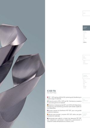 INFO CARBIDE DRILLS PU-HPU TA-4HTA SUH ALH HRC SUH MINI HL HSD C-SD-TA HSS DRILLS LFTA SUTA HSS-HSS/CO CARBIDE END-MILLS G2 MDTA HF VH/UP MEF ALU MEX/MH UH/MH C-SD-TA NC SPOTTING 90° - 120° starting drills for NC centering and chamfering on a wide range of materials. HSS Punte da centri a 90° e 120° per NC. Centratura e svasatura END-MILLS su una vasta gamma di materiali. Anbohrer mit Spitzenwinkel 90° und 120° für NC Maschinen. Zentrierung und Ansenkung auf einem sehr breiten Spektrum von Materialien. Forets à centrer et chanfreiner 90°-120°, pour une grande variété de matériaux. Brocas para puntear y escariar 90°-120° sobre una gran CARBIDE variedad de materiales. BURRS Центровочные свёрла с углами при вершине 90°-120° для сверления центровых отверстий и зенкования в широкой гамме материалов на станках с ЧПУ.