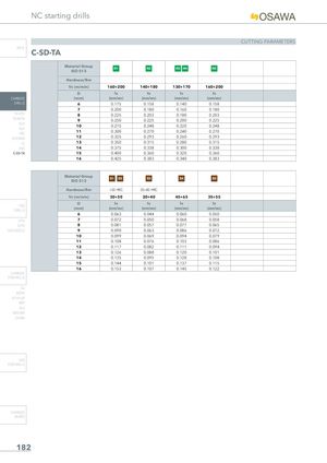 NC starting drills CUTTING PARAMETERS INFO C-SD-TA Material GroupISO 513 N1 N2 N3 N4 N5 Hardness/Rm Vc (m/min) 160÷200 140÷180 130÷170 160÷200 D fn fn fn fn CARBIDE (mm) (mm/rev) (mm/rev) (mm/rev) (mm/rev) DRILLS 6 0.175 0.158 0.140 0.158 7 0.200 0.180 0.160 0.180 PU-HPU 8 0.225 0.203 0.180 0.203 TA-4HTA 9 0.250 0.225 0.200 0.225 SUH 10 0.275 0.248 0.220 0.248 ALH HRC 11 0.300 0.270 0.240 0.270 SUH MINI 12 0.325 0.293 0.260 0.293 HL 13 0.350 0.315 0.280 0.315 HSD 14 0.375 0.338 0.300 0.338 C-SD-TA 15 0.400 0.360 0.320 0.360 16 0.425 0.383 0.340 0.383 Material GroupISO 513 S1 S2 S3 S4 S5 Hardness/Rm <35 HRC 35÷45 HRC Vc (m/min) 30÷50 20÷40 45÷65 35÷55 HSSDRILLS D fn fn fn fn(mm)(mm/rev)(mm/rev)(mm/rev)(mm/rev) 6 0.063 0.044 0.060 0.050 LFTA 7 0.072 0.050 0.068 0.058 SUTA 8 0.081 0.057 0.077 0.065 HSS-HSS/CO 9 0.090 0.063 0.086 0.072 10 0.099 0.069 0.094 0.079 11 0.108 0.076 0.103 0.086 12 0.117 0.082 0.111 0.094 13 0.126 0.088 0.120 0.101 14 0.135 0.095 0.128 0.108 15 0.144 0.101 0.137 0.115 16 0.153 0.107 0.145 0.122 CARBIDE END-MILLS G2 MDTA HF VH/UP MEF ALU MEX/MH UH/MH HSS END-MILLS CARBIDE BURRS 182