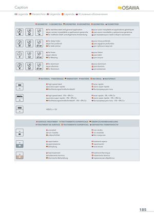 Caption Legenda Verzeichnis Légende Leyenda Условные обозначения GEOMETRY GEOMETRIA GEOMETRIE GÉOMÉTRIE GEOMETRÍA ГЕОМЕТРИЯ for stainless steel and general application pour acier inoxydable et applications génériques per acciaio inossidabile e applicazioni generiche para acero inoxidable y aplicaciones genéricas 130° 33° für rostfreien Stahl und allgemeine Anwendung для нержавеющих сталей и общего назначения for deep holes pour trous profonds per fori profondi para agujeros profundos 130° 35°÷40° für tiefe Löcher для глубоких отверстий for brass pour laiton per ottone para latón 118° 12°÷15° für Messing для латуни for aluminium pour aluminium per alluminio para aluminio 130° 35°÷40° für Aluminium для алюминия MATERIAL MATERIALE WERKSTOFF MATIÈRE MATERIAL МАТЕРИАЛ high speed steel acier rapide acciaio super rapido acero súper rápido Hochleistungsschnellschnittstahl быстрорежущая сталь HSS/Co high speed steel - 5% ÷ 8% Co acier rapide - 5% ÷ 8% Co acciaio super rapido - 5% ÷ 8% Co acero súper rápido - 5% ÷ 8% Co Hochleistungsschnellschnittstahl - 5% ÷ 8% Co быстрорежущая сталь - 5% ÷ 8% Co HSS/Co + EV SURFACE TREATMENT TRATTAMENTO SUPERFICIALE OBERFLÄCHENBEHANDLUNG TRAITMENT DE SURFACE TRATAMIENTO SUPERFICIAL ОБРАБОТКА ПОВЕРХНОСТИ ... uncoated non revêtu non rivestito no revestido BR unbeschichtet без покрытия vaporization traitment vapeur vaporizzazione vaporización Dämpfung окисление heat treatment traitment thermique trattamento termico tratamiento térmico thermische Behandlung термическая обработка 185