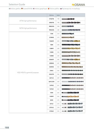 Selection Guide Indice grafico Auswahlhilfe Indice graphique Índice gráfico Руководство по выбору ITEM No. PAGE 218LFTA 194 LFTA high performance 238LFTA 198 980SUTA 204 SUTA high performance 990SUTA 208 118N 214 218NVA 219 1386STI 223 138N 228 138NTI 228 138HB 234 138WB 238 2386STI 242 238NVA 247 234NVA 252 234LS 256 HSS-HSS/Co general purpose 234LSTH 256 2691LS 259 2691LSTH 259 1692LS 261 1693LS 263 145N 265 145NTI 265 245N 270 241LS 272 2701LS 274 2702LS 276 188
