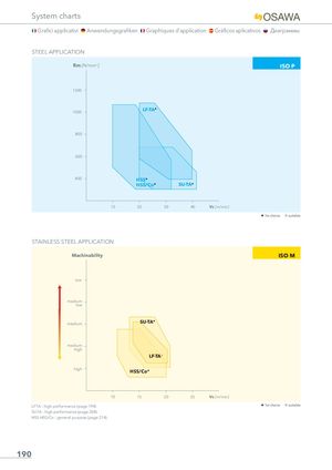 System charts Grafici applicativi Anwendungsgrafiken Graphiques d’application Gráficos aplicativos Диаграммы STEEL APPLICATION Rm [N/mm2] ISO P 1300 1000 LF-TA+ 800 600 400 HSS+ HSS/Co+ SU-TA+ 10 20 30 40 Vc [m/min] H 1st choice I suitable STAINLESS STEEL APPLICATION Machinability ISO M low medium low medium SU-TA+ medium high LF-TA, high HSS/Co+ 10 15 20 25 Vc [m/min] LFTA : high performance (page 194) H 1st choice I suitable SUTA : high performance (page 204) HSS-HSS/Co : general purpose (page 214) 190
