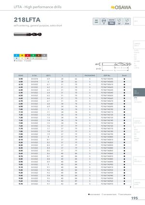 LFTA - High performance drills 218LFTA DIN1897 INFO self-centering, general purpose, extra-short CARBIDE DRILLS PU-HPU TA-4HTA P M K N S H SUH ALH H I H I HRC H 1st choice I suitable SUH MINI HL HSD C-SD-TA D(h8) D Tol. d(h7) l L PACKAGING EDP No. Stock 5.90 0/-0.018 5.9 28 66 5 P218LFTA0590 h 6.00 0/-0.018 6 28 66 5 P218LFTA0600 h 6.10 0/-0.022 6.1 31 70 5 P218LFTA0610 h 6.20 0/-0.022 6.2 31 70 5 P218LFTA0620 h 6.30 0/-0.022 6.3 31 70 5 P218LFTA0630 h HSS 6.40 0/-0.022 6.4 31 70 5 P218LFTA0640 h DRILLS 6.50 0/-0.022 6.5 31 70 5 P218LFTA0650 h 6.60 0/-0.022 6.6 31 70 5 P218LFTA0660 h LFTA 6.70 0/-0.022 6.7 31 70 5 P218LFTA0670 h SUTAHSS-HSS/CO 6.80 0/-0.022 6.8 34 74 5 P218LFTA0680 h 6.90 0/-0.022 6.9 34 74 5 P218LFTA0690 h 7.00 0/-0.022 7 34 74 5 P218LFTA0700 h 7.10 0/-0.022 7.1 34 74 5 P218LFTA0710 h 7.20 0/-0.022 7.2 34 74 5 P218LFTA0720 h 7.30 0/-0.022 7.3 34 74 5 P218LFTA0730 h 7.40 0/-0.022 7.4 34 74 5 P218LFTA0740 h CARBIDE 7.50 0/-0.022 7.5 34 74 5 P218LFTA0750 h END-MILLS 7.60 0/-0.022 7.6 37 79 5 P218LFTA0760 h 7.70 0/-0.022 7.7 37 79 5 P218LFTA0770 h G2 MDTA 7.80 0/-0.022 7.8 37 79 5 P218LFTA0780 h HF VH/UP 7.90 0/-0.022 7.9 37 79 5 P218LFTA0790 h MEF 8.00 0/-0.022 8 37 79 5 P218LFTA0800 h ALU 8.10 0/-0.022 8.1 37 79 5 P218LFTA0810 h MEX/MHUH/MH 8.20 0/-0.022 8.2 37 79 5 P218LFTA0820 h 8.30 0/-0.022 8.3 37 79 5 P218LFTA0830 h 8.40 0/-0.022 8.4 37 79 5 P218LFTA0840 h 8.50 0/-0.022 8.5 37 79 5 P218LFTA0850 h 8.60 0/-0.022 8.6 40 84 5 P218LFTA0860 h 8.70 0/-0.022 8.7 40 84 5 P218LFTA0870 h 8.80 0/-0.022 8.8 40 84 5 P218LFTA0880 h HSS 8.90 0/-0.022 8.9 40 84 5 P218LFTA0890 h END-MILLS 9.00 0/-0.022 9 40 84 5 P218LFTA0900 h 9.10 0/-0.022 9.1 40 84 5 P218LFTA0910 h 9.20 0/-0.022 9.2 40 84 5 P218LFTA0920 h 9.30 0/-0.022 9.3 40 84 5 P218LFTA0930 h 9.40 0/-0.022 9.4 40 84 5 P218LFTA0940 h 9.50 0/-0.022 9.5 40 84 5 P218LFTA0950 h 9.60 0/-0.022 9.6 43 89 5 P218LFTA0960 h 9.70 0/-0.022 9.7 43 89 5 P218LFTA0970 h CARBIDEBURRS h stock standard f non-standard stock m stock exhaustion 195