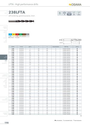 LFTA - High performance drills INFO 238LFTA DIN338 self-centering, general purpose, short CARBIDE DRILLS PU-HPU TA-4HTA SUH P M K N S H ALH HRC H I H I SUH MINI H 1st choice I suitable HL HSD C-SD-TA D(h8) D Tol. d(h7) l L PACKAGING EDP No. Stock 2.00 0/-0.014 2 24 49 5 P238LFTA0200 h 2.10 0/-0.014 2.1 24 49 5 P238LFTA0210 h 2.20 0/-0.014 2.2 27 53 5 P238LFTA0220 h 2.30 0/-0.014 2.3 27 53 5 P238LFTA0230 h 2.40 0/-0.014 2.4 30 57 5 P238LFTA0240 h HSS DRILLS 2.50 0/-0.014 2.5 30 57 5 P238LFTA0250 h 2.60 0/-0.014 2.6 30 57 5 P238LFTA0260 h LFTA 2.70 0/-0.014 2.7 33 61 5 P238LFTA0270 h SUTAHSS-HSS/CO2.80 0/-0.014 2.8 33 61 5 P238LFTA0280 h 2.90 0/-0.014 2.9 33 61 5 P238LFTA0290 h 3.00 0/-0.014 3 33 61 5 P238LFTA0300 h 3.10 0/-0.018 3.1 36 65 5 P238LFTA0310 h 3.20 0/-0.018 3.2 36 65 5 P238LFTA0320 h 3.30 0/-0.018 3.3 36 65 5 P238LFTA0330 h 3.40 0/-0.018 3.4 39 70 5 P238LFTA0340 h CARBIDE 3.50 0/-0.018 3.5 39 70 5 P238LFTA0350 h END-MILLS 3.60 0/-0.018 3.6 39 70 5 P238LFTA0360 h 3.70 0/-0.018 3.7 39 70 5 P238LFTA0370 h G2 3.80 0/-0.018 3.8 43 75 5 P238LFTA0380 h MDTA HF VH/UP 3.90 0/-0.018 3.9 43 75 5 P238LFTA0390 h MEF 4.00 0/-0.018 4 43 75 5 P238LFTA0400 h ALU 4.10 0/-0.018 4.1 43 75 5 P238LFTA0410 h MEX/MHUH/MH 4.20 0/-0.018 4.2 43 75 5 P238LFTA0420 h 4.30 0/-0.018 4.3 47 80 5 P238LFTA0430 h 4.40 0/-0.018 4.4 47 80 5 P238LFTA0440 h 4.50 0/-0.018 4.5 47 80 5 P238LFTA0450 h 4.60 0/-0.018 4.6 47 80 5 P238LFTA0460 h 4.70 0/-0.018 4.7 47 80 5 P238LFTA0470 h 4.80 0/-0.018 4.8 52 86 5 P238LFTA0480 h HSS 4.90 0/-0.018 4.9 52 86 5 P238LFTA0490 h END-MILLS 5.00 0/-0.018 5 52 86 5 P238LFTA0500 h 5.10 0/-0.018 5.1 52 86 5 P238LFTA0510 h 5.20 0/-0.018 5.2 52 86 5 P238LFTA0520 h 5.30 0/-0.018 5.3 52 86 5 P238LFTA0530 h 5.40 0/-0.018 5.4 57 93 5 P238LFTA0540 h 5.50 0/-0.018 5.5 57 93 5 P238LFTA0550 h 5.60 0/-0.018 5.6 57 93 5 P238LFTA0560 h 5.70 0/-0.018 5.7 57 93 5 P238LFTA0570 h CARBIDEBURRS 5.80 0/-0.018 5.8 57 93 5 P238LFTA0580 h h stock standard f non-standard stock m stock exhaustion 198