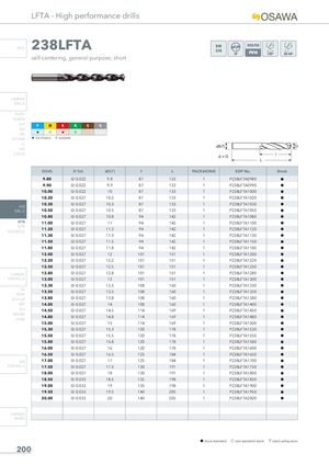 LFTA - High performance drills INFO 238LFTA DIN338 self-centering, general purpose, short CARBIDE DRILLS PU-HPU TA-4HTA SUH P M K N S H ALH HRC H I H I SUH MINI H 1st choice I suitable HL HSD C-SD-TA D(h8) D Tol. d(h7) l L PACKAGING EDP No. Stock 9.80 0/-0.022 9.8 87 133 1 P238LFTA0980 h 9.90 0/-0.022 9.9 87 133 1 P238LFTA0990 h 10.00 0/-0.022 10 87 133 1 P238LFTA1000 h 10.20 0/-0.027 10.2 87 133 1 P238LFTA1020 h 10.30 0/-0.027 10.3 87 133 1 P238LFTA1030 h HSS DRILLS 10.50 0/-0.027 10.5 87 133 1 P238LFTA1050 h 10.80 0/-0.027 10.8 94 142 1 P238LFTA1080 h LFTA 11.00 0/-0.027 11 94 142 1 P238LFTA1100 h SUTAHSS-HSS/CO11.20 0/-0.027 11.2 94 142 1 P238LFTA1120 h 11.30 0/-0.027 11.3 94 142 1 P238LFTA1130 h 11.50 0/-0.027 11.5 94 142 1 P238LFTA1150 h 11.80 0/-0.027 11.8 94 142 1 P238LFTA1180 h 12.00 0/-0.027 12 101 151 1 P238LFTA1200 h 12.20 0/-0.027 12.2 101 151 1 P238LFTA1220 h 12.50 0/-0.027 12.5 101 151 1 P238LFTA1250 h CARBIDE 12.80 0/-0.027 12.8 101 151 1 P238LFTA1280 h END-MILLS 13.00 0/-0.027 13 101 151 1 P238LFTA1300 h 13.30 0/-0.027 13.3 108 160 1 P238LFTA1330 h G2 13.50 0/-0.027 13.5 108 160 1 P238LFTA1350 h MDTA HF VH/UP 13.80 0/-0.027 13.8 108 160 1 P238LFTA1380 h MEF 14.00 0/-0.027 14 108 160 1 P238LFTA1400 h ALU 14.50 0/-0.027 14.5 114 169 1 P238LFTA1450 h MEX/MHUH/MH 14.80 0/-0.027 14.8 114 169 1 P238LFTA1480 h 15.00 0/-0.027 15 114 169 1 P238LFTA1500 h 15.30 0/-0.027 15.3 120 178 1 P238LFTA1530 h 15.50 0/-0.027 15.5 120 178 1 P238LFTA1550 h 15.80 0/-0.027 15.8 120 178 1 P238LFTA1580 h 16.00 0/-0.027 16 120 178 1 P238LFTA1600 h 16.50 0/-0.027 16.5 125 184 1 P238LFTA1650 h HSS 17.00 0/-0.027 17 125 184 1 P238LFTA1700 h END-MILLS 17.50 0/-0.027 17.5 130 191 1 P238LFTA1750 h 18.00 0/-0.027 18 130 191 1 P238LFTA1800 h 18.50 0/-0.033 18.5 135 198 1 P238LFTA1850 h 19.00 0/-0.033 19 135 198 1 P238LFTA1900 h 19.50 0/-0.033 19.5 140 205 1 P238LFTA1950 h 20.00 0/-0.033 20 140 205 1 P238LFTA2000 h CARBIDE BURRS h stock standard f non-standard stock m stock exhaustion 200