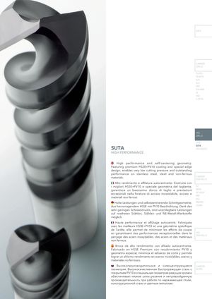INFO CARBIDE DRILLS PU-HPU TA-4HTA SUH ALH HRC SUH MINI HL HSD C-SD-TA HSS DRILLS LFTA SUTA SUTAHSS-HSS/CO HIGH PERFORMANCE High performance and self-centering geometry. Featuring premium HSSE+PV10 coating and special edge design, enables very low cutting pressure and outstanding performance on stainless steel, steel and non-ferrous materials. CARBIDE END-MILLS Alto rendimento e affilatura autocentrante. Costruita con i migliori HSSE+PV10 e speciale geometria del tagliente, G2 garantisce un bassissimo sforzo di taglio e prestazioni MDTA eccezionali nella foratura di acciaio inossidabile, acciaio e HF VH/UP materiali non ferrosi. MEFALU Hohe Leistungen und selbstzentrierende Schnittgeometrie. MEX/MH Aus hervorragendem HSSE mit PV10 Beschichtung. Dank des UH/MH sehr geringen Schneiddrucks, sind unschlagbare Leistungen auf rostfreien Stählen, Stählen und NE-Metall-Werkstoffe möglich. Haute performance et affûtage autocentré. Fabriquée avec les meilleurs HSSE+PV10 et une géométrie spécifique de l'arête, elle permet de minimiser les efforts de coupe en garantissant des performances exceptionnelles dans le HSS perçage des aciers inoxydables, des aciers et des matériaux END-MILLS non ferreux. Broca de alto rendimiento con afilado autocentrante. Fabricada en HSSE Premium con recubrimiento PV10 y geometría especial, minimiza el esfuerzo de corte y permite lograr un altísimo rendimiento en aceros inoxidables, aceros y materiales no ferrosos. Высокопроизводительная и самоцентрующаяся CARBIDE геометрия. Высококачественная быстрорежущая сталь с BURRS покрытием PV10 и специальная геометрия режущих кромок обеспечивает низкие силы резания и непревзойденную производительность при работе по нержавеющей стали, конструкционной стали и цветным металлам.