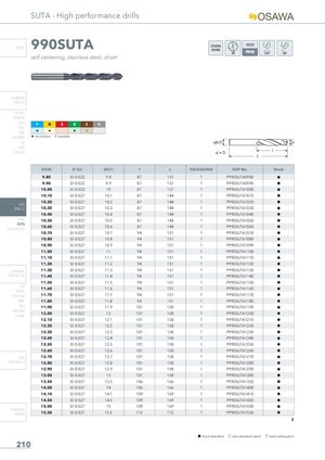 SUTA - High performance drills INFO 990SUTA OSAWANORM self centering, stainless steel, short CARBIDE DRILLS PU-HPU TA-4HTA SUH P M K N S H ALH HRC H H H I SUH MINI H 1st choice I suitable HL HSD C-SD-TA D(h8) D Tol. d(h7) l L PACKAGING EDP No. Stock 9.80 0/-0.022 9.8 87 137 1 P990SUTA0980 h 9.90 0/-0.022 9.9 87 137 1 P990SUTA0990 h 10.00 0/-0.022 10 87 137 1 P990SUTA1000 h 10.10 0/-0.027 10.1 87 144 1 P990SUTA1010 h 10.20 0/-0.027 10.2 87 144 1 P990SUTA1020 h HSS DRILLS 10.30 0/-0.027 10.3 87 144 1 P990SUTA1030 h 10.40 0/-0.027 10.4 87 144 1 P990SUTA1040 h LFTA 10.50 0/-0.027 10.5 87 144 1 P990SUTA1050 h SUTAHSS-HSS/CO10.60 0/-0.027 10.6 87 144 1 P990SUTA1060 h 10.70 0/-0.027 10.7 94 151 1 P990SUTA1070 h 10.80 0/-0.027 10.8 94 151 1 P990SUTA1080 h 10.90 0/-0.027 10.9 94 151 1 P990SUTA1090 h 11.00 0/-0.027 11 94 151 1 P990SUTA1100 h 11.10 0/-0.027 11.1 94 151 1 P990SUTA1110 h 11.20 0/-0.027 11.2 94 151 1 P990SUTA1120 h CARBIDE 11.30 0/-0.027 11.3 94 151 1 P990SUTA1130 h END-MILLS 11.40 0/-0.027 11.4 94 151 1 P990SUTA1140 h 11.50 0/-0.027 11.5 94 151 1 P990SUTA1150 h G2 11.60 0/-0.027 11.6 94 151 1 P990SUTA1160 h MDTA HF VH/UP 11.70 0/-0.027 11.7 94 151 1 P990SUTA1170 h MEF 11.80 0/-0.027 11.8 94 151 1 P990SUTA1180 h ALU 11.90 0/-0.027 11.9 101 158 1 P990SUTA1190 h MEX/MHUH/MH 12.00 0/-0.027 12 101 158 1 P990SUTA1200 h 12.10 0/-0.027 12.1 101 158 1 P990SUTA1210 h 12.20 0/-0.027 12.2 101 158 1 P990SUTA1220 h 12.30 0/-0.027 12.3 101 158 1 P990SUTA1230 h 12.40 0/-0.027 12.4 101 158 1 P990SUTA1240 h 12.50 0/-0.027 12.5 101 158 1 P990SUTA1250 h 12.60 0/-0.027 12.6 101 158 1 P990SUTA1260 h HSS 12.70 0/-0.027 12.7 101 158 1 P990SUTA1270 h END-MILLS 12.80 0/-0.027 12.8 101 158 1 P990SUTA1280 h 12.90 0/-0.027 12.9 101 158 1 P990SUTA1290 h 13.00 0/-0.027 13 101 158 1 P990SUTA1300 h 13.50 0/-0.027 13.5 106 166 1 P990SUTA1350 h 14.00 0/-0.027 14 106 166 1 P990SUTA1400 h 14.10 0/-0.027 14.1 109 169 1 P990SUTA1410 h 14.50 0/-0.027 14.5 109 169 1 P990SUTA1450 h 15.00 0/-0.027 15 109 169 1 P990SUTA1500 h CARBIDEBURRS 15.50 0/-0.027 15.5 112 172 1 P990SUTA1550 h h stock standard f non-standard stock m stock exhaustion 210