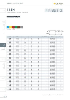 HSS and HSS/Co drills INFO 118N DIN1897 N type for general purpose, extra-short CARBIDE DRILLS PU-HPU TA-4HTA SUH P M K N S H ALH HRC H I I SUH MINI H 1st choice I suitable HL HSD C-SD-TA D(h8) D Tol. d l L PACKAGING EDP No. Stock 7.50 0/-0.022 7.5 34 74 5 P118N0750 h 7.60 0/-0.022 7.6 37 79 5 P118N0760 h 7.70 0/-0.022 7.7 37 79 5 P118N0770 f 7.75 0/-0.022 7.75 37 79 5 P118N0775 h 7.80 0/-0.022 7.8 37 79 5 P118N0780 h HSS DRILLS 7.90 0/-0.022 7.9 37 79 5 P118N0790 f 8.00 0/-0.022 8 37 79 5 P118N0800 h LFTA 8.10 0/-0.022 8.1 37 79 5 P118N0810 h SUTAHSS-HSS/CO8.20 0/-0.022 8.2 37 79 5 P118N0820 h 8.25 0/-0.022 8.25 37 79 5 P118N0825 h 8.30 0/-0.022 8.3 37 79 5 P118N0830 f 8.40 0/-0.022 8.4 37 79 5 P118N0840 f 8.50 0/-0.022 8.5 37 79 5 P118N0850 h 8.60 0/-0.022 8.6 40 84 5 P118N0860 h 8.70 0/-0.022 8.7 40 84 5 P118N0870 f CARBIDE 8.75 0/-0.022 8.75 40 84 5 P118N0875 h END-MILLS 8.80 0/-0.022 8.8 40 84 5 P118N0880 f 8.90 0/-0.022 8.9 40 84 5 P118N0890 h G2 9.00 0/-0.022 9 40 84 5 P118N0900 h MDTA HF VH/UP 9.10 0/-0.022 9.1 40 84 5 P118N0910 h MEF 9.20 0/-0.022 9.2 40 84 5 P118N0920 f ALU 9.25 0/-0.022 9.25 40 84 5 P118N0925 f MEX/MHUH/MH 9.30 0/-0.022 9.3 40 84 5 P118N0930 f 9.40 0/-0.022 9.4 40 84 5 P118N0940 f 9.50 0/-0.022 9.5 40 84 5 P118N0950 h 9.60 0/-0.022 9.6 43 89 5 P118N0960 f 9.70 0/-0.022 9.7 43 89 5 P118N0970 f 9.75 0/-0.022 9.75 43 89 5 P118N0975 f 9.80 0/-0.022 9.8 43 89 5 P118N0980 f HSS 9.90 0/-0.022 9.9 43 89 5 P118N0990 f END-MILLS 10.00 0/-0.022 10 43 89 5 P118N1000 h 10.25 0/-0.027 10.25 43 89 5 P118N1025 h 10.50 0/-0.027 10.5 43 89 5 P118N1050 h 10.75 0/-0.027 10.75 47 95 5 P118N1075 h 11.00 0/-0.027 11 47 95 5 P118N1100 h 11.25 0/-0.027 11.25 47 95 5 P118N1125 h 11.50 0/-0.027 11.5 47 95 5 P118N1150 h 11.75 0/-0.027 11.75 47 95 5 P118N1175 h CARBIDEBURRS 12.00 0/-0.027 12 51 102 5 P118N1200 h h stock standard f non-standard stock m stock exhaustion 216