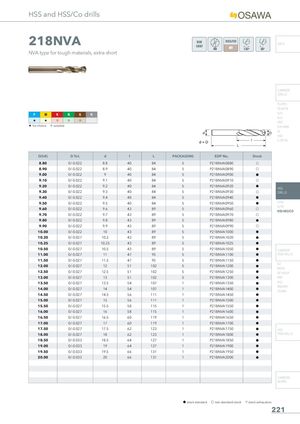 HSS and HSS/Co drills 218NVA DIN1897 INFO NVA type for tough materials, extra-short CARBIDE DRILLS PU-HPU TA-4HTA P M K N S H SUH ALH H H I I I HRC H 1st choice I suitable SUH MINI HL HSD C-SD-TA D(h8) D Tol. d l L PACKAGING EDP No. Stock 8.80 0/-0.022 8.8 40 84 5 P218NVA0880 f 8.90 0/-0.022 8.9 40 84 5 P218NVA0890 f 9.00 0/-0.022 9 40 84 5 P218NVA0900 h 9.10 0/-0.022 9.1 40 84 5 P218NVA0910 f 9.20 0/-0.022 9.2 40 84 5 P218NVA0920 h HSS 9.30 0/-0.022 9.3 40 84 5 P218NVA0930 f DRILLS 9.40 0/-0.022 9.4 40 84 5 P218NVA0940 h 9.50 0/-0.022 9.5 40 84 5 P218NVA0950 h LFTA 9.60 0/-0.022 9.6 43 89 5 P218NVA0960 f SUTAHSS-HSS/CO 9.70 0/-0.022 9.7 43 89 5 P218NVA0970 f 9.80 0/-0.022 9.8 43 89 5 P218NVA0980 h 9.90 0/-0.022 9.9 43 89 5 P218NVA0990 f 10.00 0/-0.022 10 43 89 5 P218NVA1000 h 10.20 0/-0.027 10.2 43 89 5 P218NVA1020 h 10.25 0/-0.027 10.25 43 89 5 P218NVA1025 h 10.50 0/-0.027 10.5 43 89 5 P218NVA1050 h CARBIDE 11.00 0/-0.027 11 47 95 5 P218NVA1100 h END-MILLS 11.50 0/-0.027 11.5 47 95 5 P218NVA1150 h 12.00 0/-0.027 12 51 102 5 P218NVA1200 h G2 MDTA 12.50 0/-0.027 12.5 51 102 5 P218NVA1250 h HF VH/UP 13.00 0/-0.027 13 51 102 5 P218NVA1300 h MEF 13.50 0/-0.027 13.5 54 107 1 P218NVA1350 h ALU 14.00 0/-0.027 14 54 107 1 P218NVA1400 h MEX/MHUH/MH 14.50 0/-0.027 14.5 56 111 1 P218NVA1450 h 15.00 0/-0.027 15 56 111 1 P218NVA1500 h 15.50 0/-0.027 15.5 58 115 1 P218NVA1550 h 16.00 0/-0.027 16 58 115 1 P218NVA1600 h 16.50 0/-0.027 16.5 60 119 1 P218NVA1650 h 17.00 0/-0.027 17 60 119 1 P218NVA1700 h 17.50 0/-0.027 17.5 62 123 1 P218NVA1750 h HSS 18.00 0/-0.027 18 62 123 1 P218NVA1800 h END-MILLS 18.50 0/-0.033 18.5 64 127 1 P218NVA1850 h 19.00 0/-0.033 19 64 127 1 P218NVA1900 h 19.50 0/-0.033 19.5 66 131 1 P218NVA1950 h 20.00 0/-0.033 20 66 131 1 P218NVA2000 h CARBIDE BURRS h stock standard f non-standard stock m stock exhaustion 221