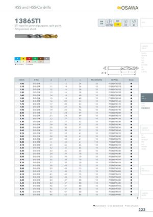 HSS and HSS/Co drills 1386STI DIN338 INFO STI type for general purpose, split point, TiN pointed, short CARBIDE DRILLS PU-HPU TA-4HTA P M K N S H SUH ALH H I H I I HRC H 1st choice I suitable SUH MINI HL HSD C-SD-TA D(h8) D Tol. d l L PACKAGING EDP No. Stock 1.00 0/-0.014 1 12 34 10 P1385NTI0100 h 1.10 0/-0.014 1.1 14 36 10 P1385NTI0110 h 1.20 0/-0.014 1.2 16 38 10 P1385NTI0120 h 1.30 0/-0.014 1.3 16 38 10 P1385NTI0130 h 1.40 0/-0.014 1.4 18 40 10 P1385NTI0140 h HSS 1.50 0/-0.014 1.5 18 40 10 P1385NTI0150 h DRILLS 1.60 0/-0.014 1.6 20 43 10 P1386STI0160 h 1.70 0/-0.014 1.7 20 43 10 P1386STI0170 h LFTA 1.80 0/-0.014 1.8 22 46 10 P1386STI0180 h SUTAHSS-HSS/CO 1.90 0/-0.014 1.9 22 46 10 P1386STI0190 h 2.00 0/-0.014 2 24 49 10 P1386STI0200 h 2.10 0/-0.014 2.1 24 49 10 P1386STI0210 h 2.20 0/-0.014 2.2 27 53 10 P1386STI0220 h 2.30 0/-0.014 2.3 27 53 10 P1386STI0230 h 2.40 0/-0.014 2.4 30 57 10 P1386STI0240 h 2.50 0/-0.014 2.5 30 57 10 P1386STI0250 h CARBIDE 2.60 0/-0.014 2.6 30 57 10 P1386STI0260 h END-MILLS 2.70 0/-0.014 2.7 33 61 10 P1386STI0270 h 2.80 0/-0.014 2.8 33 61 10 P1386STI0280 h G2 MDTA 2.90 0/-0.014 2.9 33 61 10 P1386STI0290 h HF VH/UP 3.00 0/-0.014 3 33 61 10 P1386STI0300 h MEF 3.10 0/-0.018 3.1 36 65 10 P1386STI0310 h ALU 3.20 0/-0.018 3.2 36 65 10 P1386STI0320 h MEX/MHUH/MH 3.30 0/-0.018 3.3 36 65 10 P1386STI0330 h 3.40 0/-0.018 3.4 39 70 10 P1386STI0340 h 3.50 0/-0.018 3.5 39 70 10 P1386STI0350 h 3.60 0/-0.018 3.6 39 70 10 P1386STI0360 h 3.70 0/-0.018 3.7 39 70 10 P1386STI0370 h 3.80 0/-0.018 3.8 43 75 10 P1386STI0380 h 3.90 0/-0.018 3.9 43 75 10 P1386STI0390 h HSS 4.00 0/-0.018 4 43 75 10 P1386STI0400 h END-MILLS 4.10 0/-0.018 4.1 43 75 10 P1386STI0410 h 4.20 0/-0.018 4.2 43 75 10 P1386STI0420 h 4.30 0/-0.018 4.3 47 80 10 P1386STI0430 h 4.40 0/-0.018 4.4 47 80 10 P1386STI0440 h 4.50 0/-0.018 4.5 47 80 10 P1386STI0450 h 4.60 0/-0.018 4.6 47 80 10 P1386STI0460 h 4.70 0/-0.018 4.7 47 80 10 P1386STI0470 h 4.80 0/-0.018 4.8 52 86 10 P1386STI0480 h CARBIDEBURRS h stock standard f non-standard stock m stock exhaustion 223